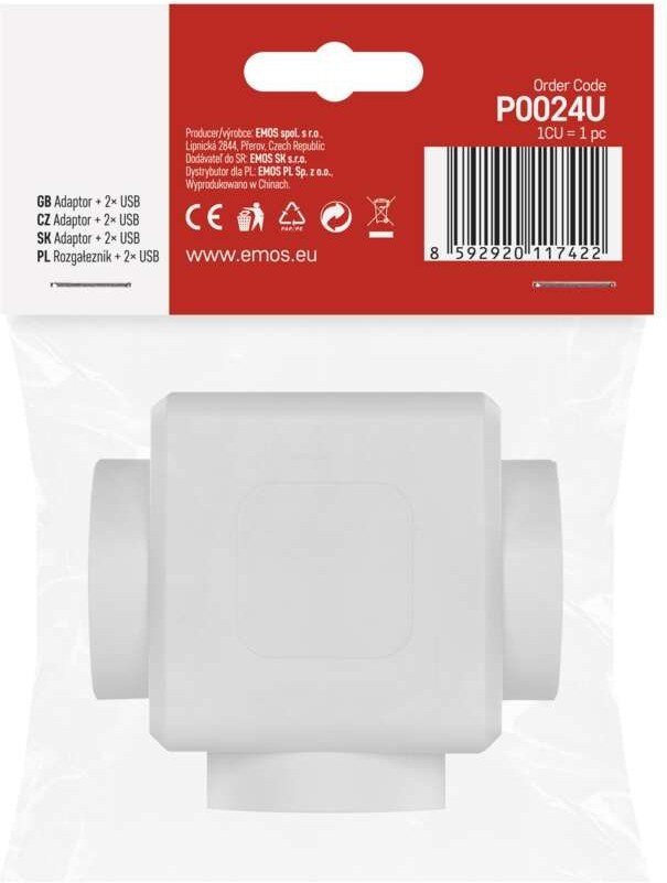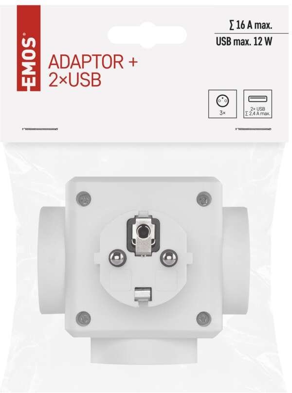 Emos P0024U, rozbočovacia zásuvka 3× guľatá 230V, 2x USB-A