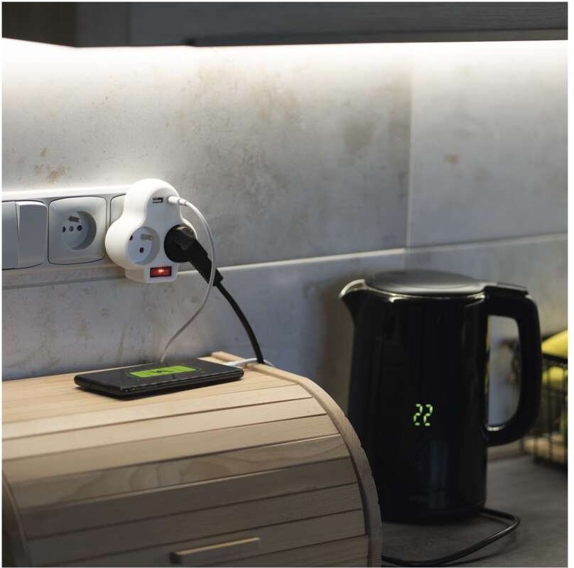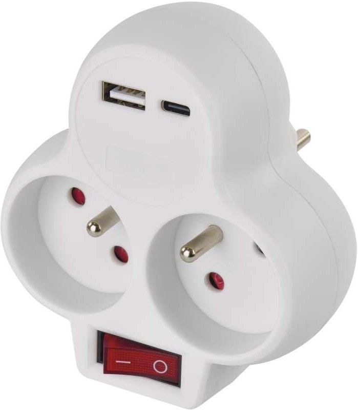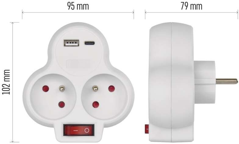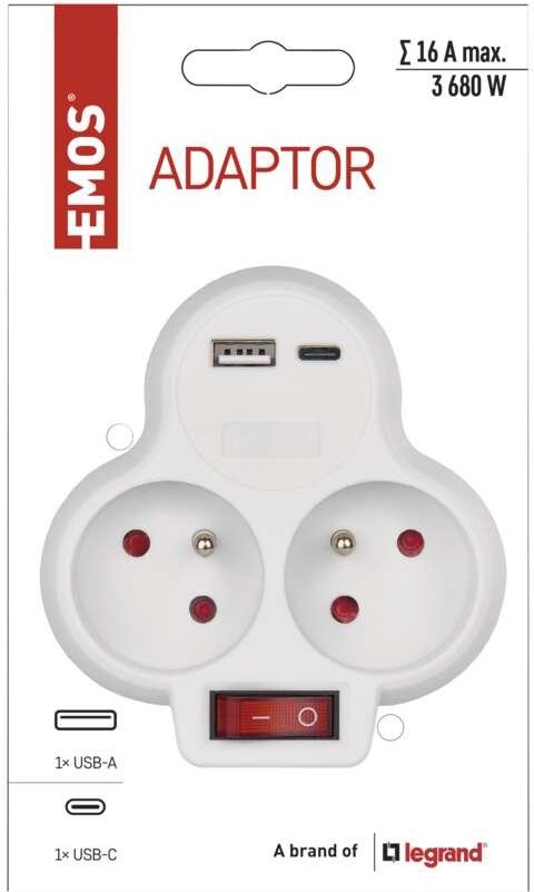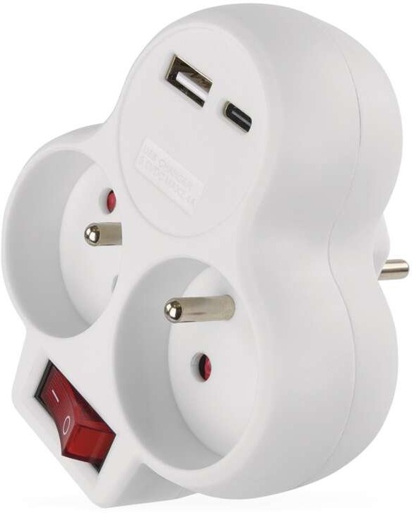 Emos P0073, rozbočovacia zásuvka 2x, vyp., 1xUSB-A+1xUSB-C, biela