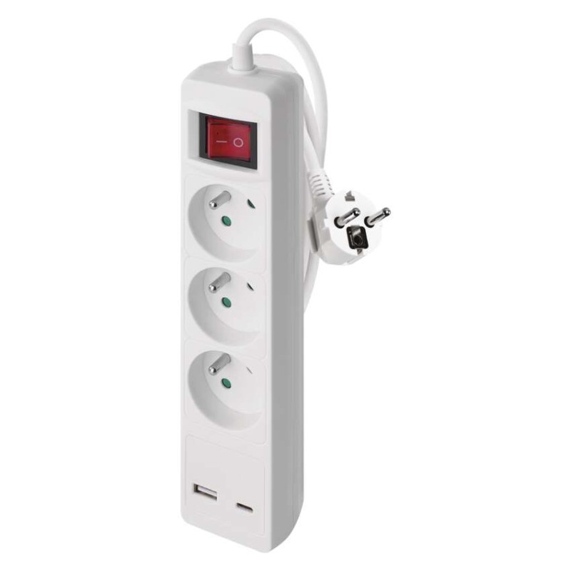 predlžovací kábel 2m s 1×USB-A + 1×USB-C, 3 zásuvky, s vypínačom, biely, 1,5 mm2Zobraziť viac