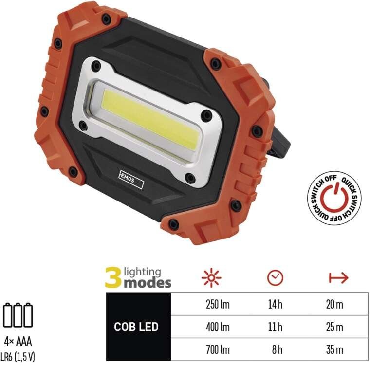 Emos P4113, COB LED pracovné svietidlo, 700 lm, 4× AA