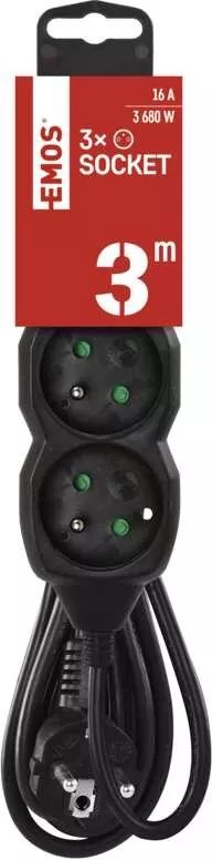 Emos PC0313R, predlžovací kábel 3m, 3 zásuvky, PVC, čierny, 1,5 mm2