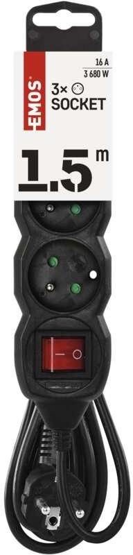 Emos PC1311, predlžovací kábel 230V 3x zásuvka 1,5m s vypínačom čierny