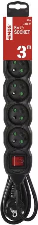 Emos PC1513R, predlžovací kábel 3m, 5 zásuviek, s vypínačom, PVC, čierny, 1,5 mm2