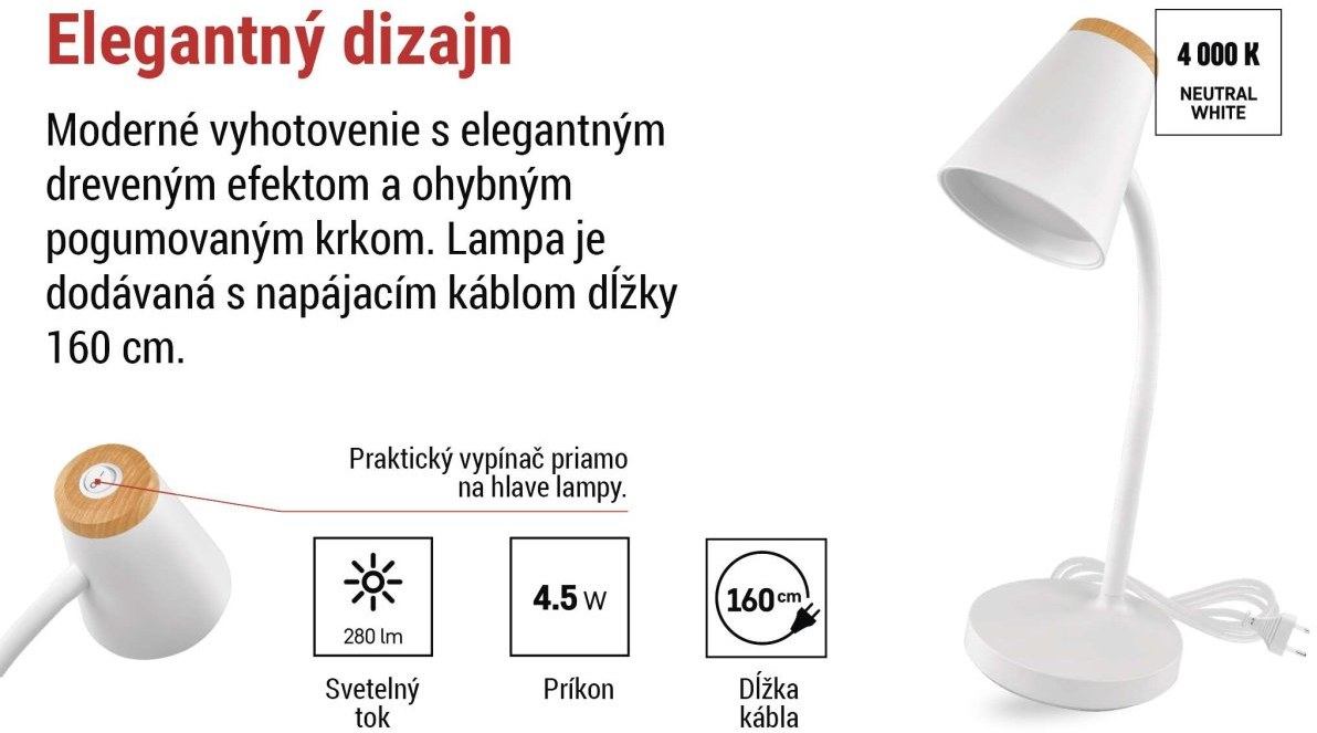 LED stolná lampa, svetelný tok 280 lm, chromatickosť 4000 K (neutrálna biela), príkon 5 W, napájanie z 230V, farba bielaZobraziť viac