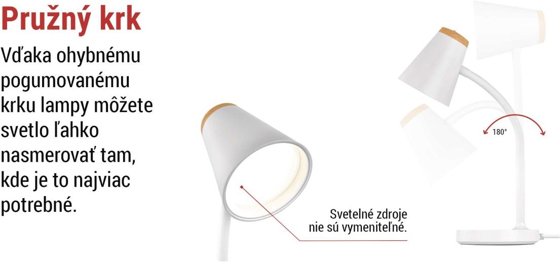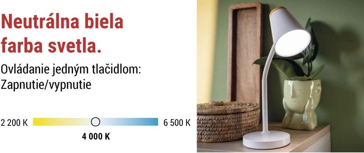 Integrovaný 4,5 W svetelný zdroj LED poskytuje neutrálne biele svetlo (4 000 K), ktoré neunavuje oči a vytvára príjemnú atmosféru na sústredenú prácu a relaxáciu.
