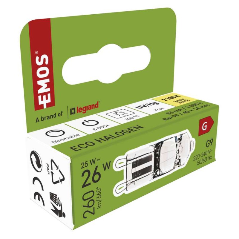 Emos ZE0304, halogénová žiarovka JC, 25W, G9, teplá biela
