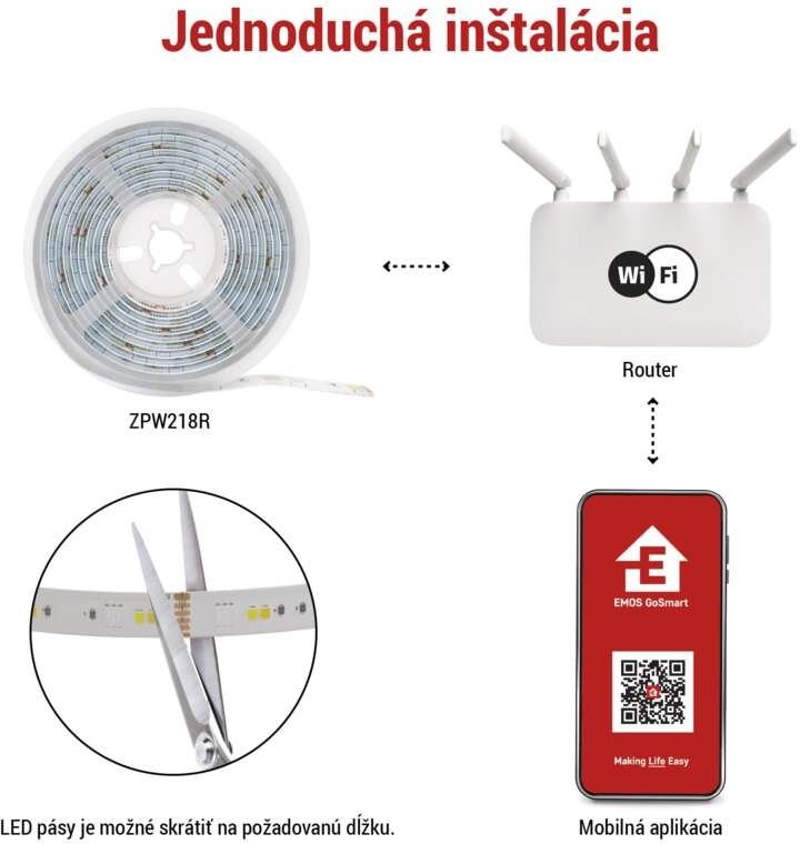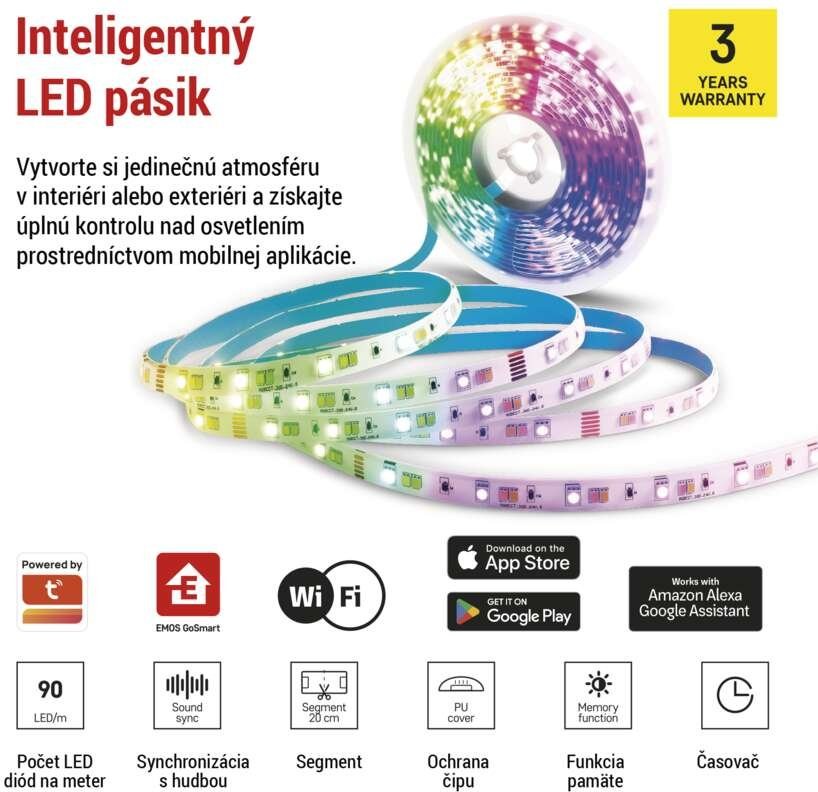 Vytvorte si vlastnú inteligentnú domácnosť s EMOS GoSmart a ďalšími inteligentnými zariadeniami kompatibilnými s TUYA. Pripojte jednotlivé produkty, nastavte automatizáciu ich činností a ovládajte ich na diaľku pomocou plne lokalizovanej a intuitívnej mobilnej aplikácie.Vytvorte jedinečnú atmosféru vo svojom interiéri a získajte úplnú kontrolu nad osvetlením pomocou inteligentných LED pásikov EMOS GoSmart s technológiou Wi-Fi. Vytvárajte rôzne scény a animácie, nastavujte farby svetla a úrovne jasu podľa svojich potrieb. Vďaka mobilnej aplikácii máte ovládanie vždy na dosah ruky. LED pásy sú ideálne na osvetlenie celej miestnosti a zvýraznenie estetických prvkov s možnosťou stmievania a zmeny farieb RGB.