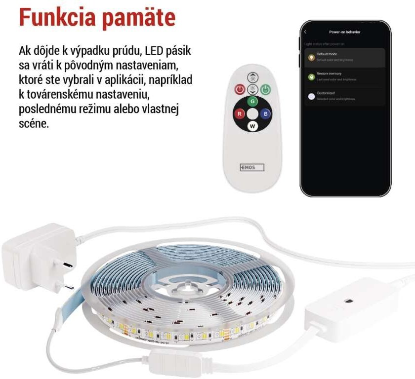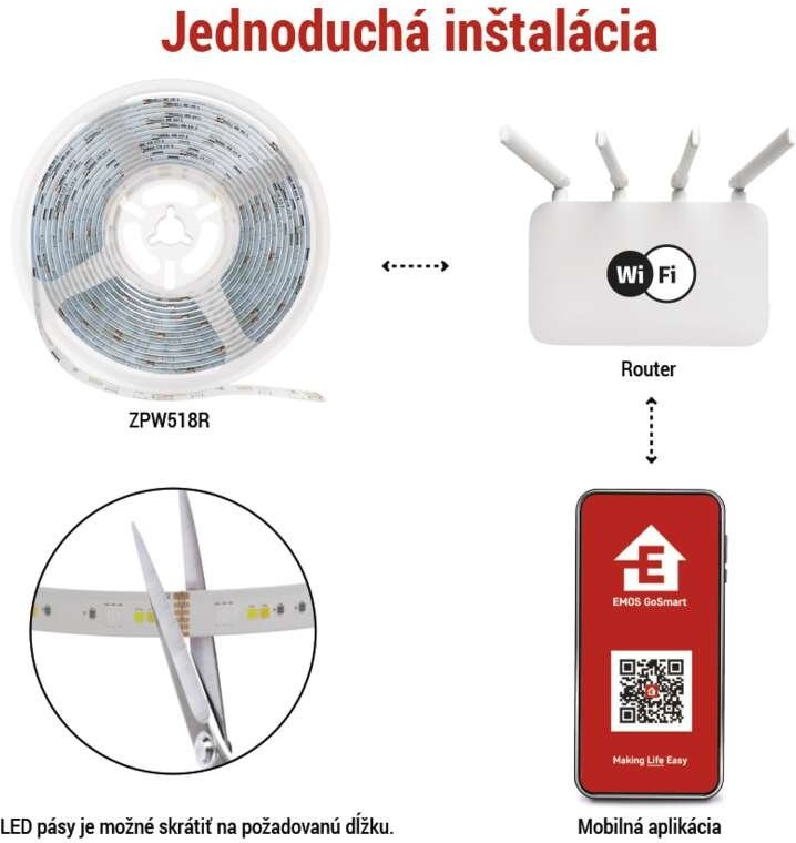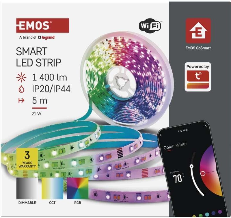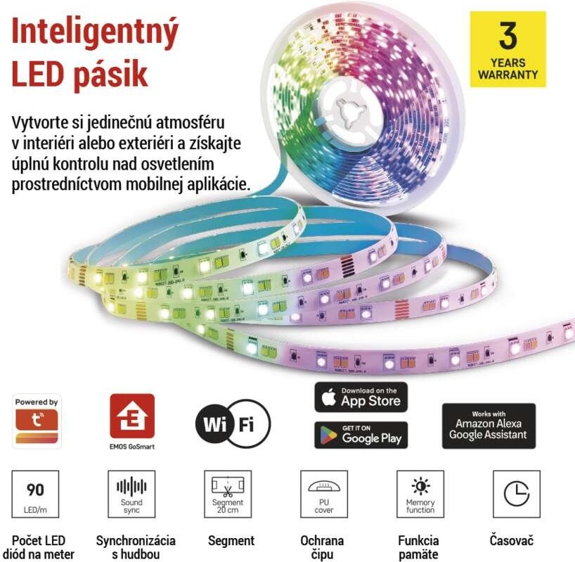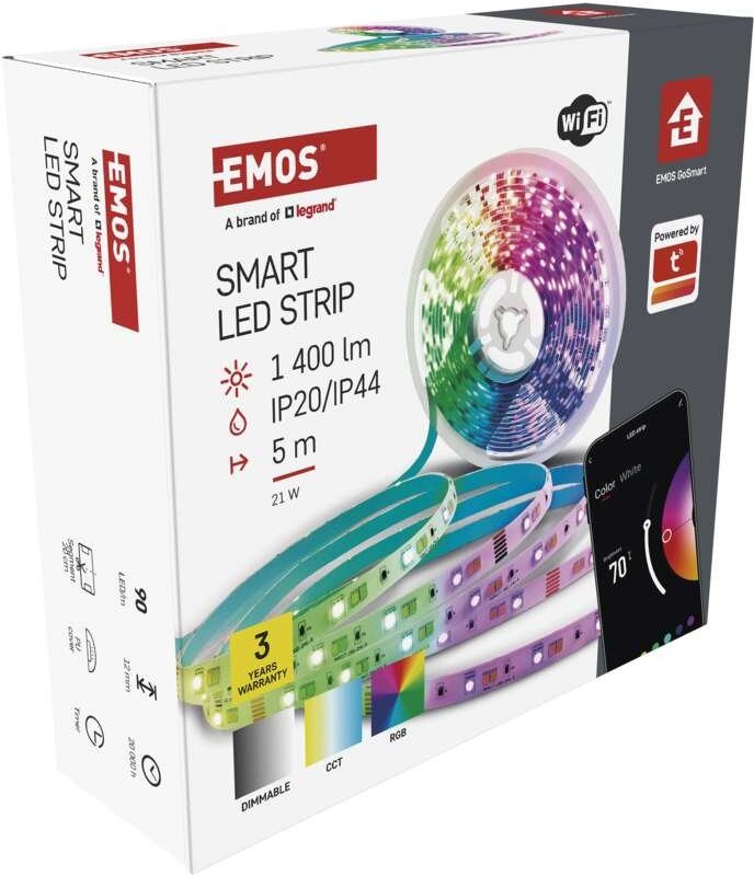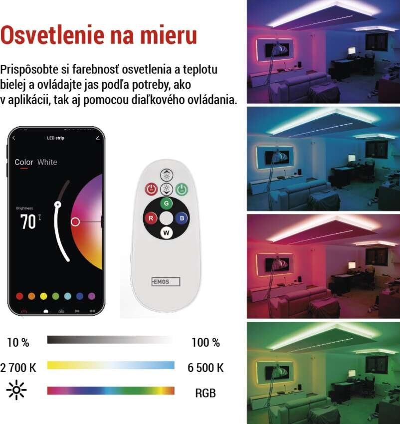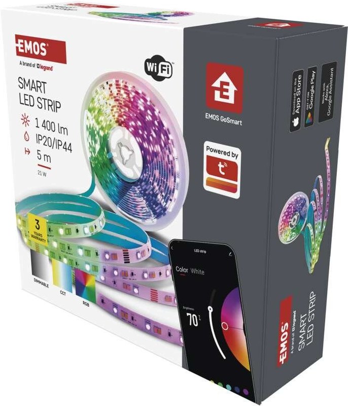 Vytvorte si vlastnú inteligentnú domácnosť s inteligentnými zariadeniami EMOS GoSmart a ďalšími zariadeniami kompatibilnými s TUYA. Pripojte jednotlivé produkty, nastavte automatizáciu ich činností a ovládajte ich na diaľku pomocou plne lokalizovanej a intuitívnej mobilnej aplikácie.Vytvorte jedinečnú atmosféru vo svojom interiéri a získajte úplnú kontrolu nad osvetlením pomocou inteligentných LED pásikov EMOS GoSmart s technológiou Wi-Fi. Vytvárajte rôzne scény a animácie, nastavujte farby svetla a úrovne jasu podľa svojich potrieb. Vďaka mobilnej aplikácii máte ovládanie vždy na dosah ruky. LED pásy sú ideálne na osvetlenie celej miestnosti a zvýraznenie estetických prvkov s možnosťou stmievania a zmeny farieb RGB.
