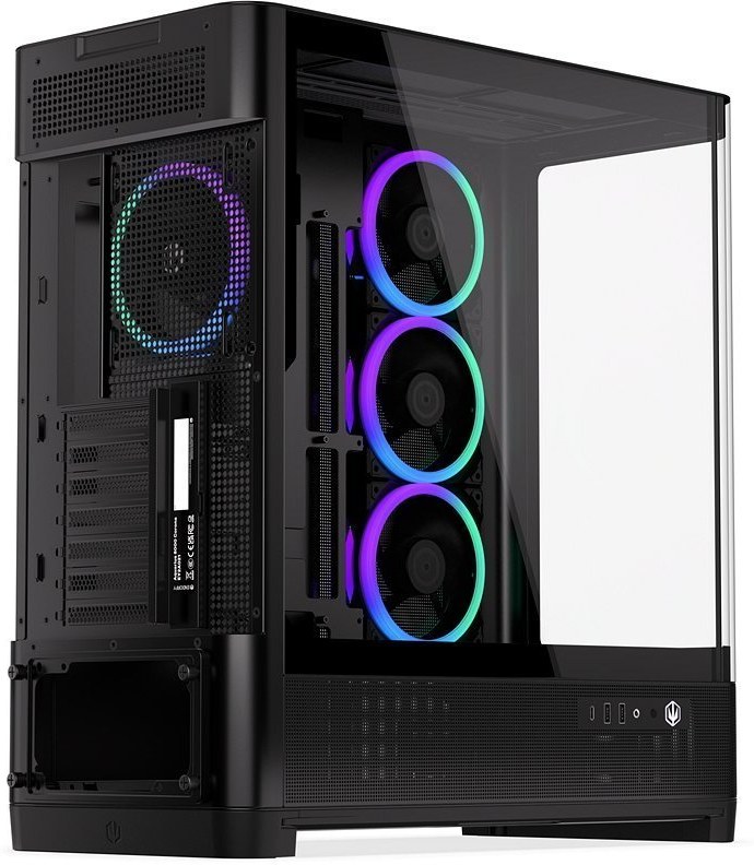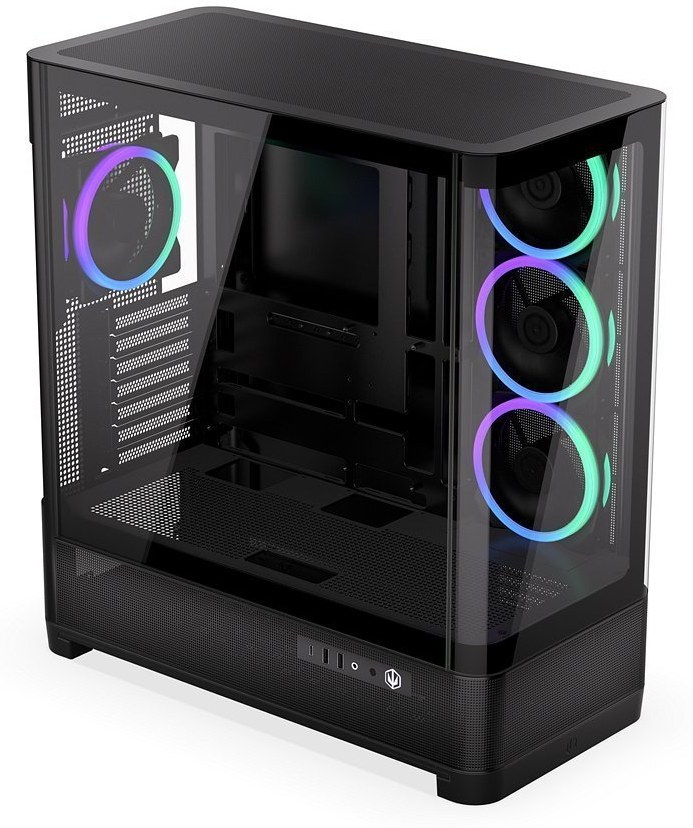 Endorfy Aquarius 8000 Corona nie je len obyčajná počítačová skriňa; je to dizajnový kúsok, ktorý do vášho herného či pracovného priestoru prináša estetiku inšpirovanú eleganciou 60. rokov. Dominantným prvkom je unikátne zakrivené predné sklo, ktoré plynule nadväzuje na bočný panel z tvrdeného skla. Tento panoramatický „fish-tank“ koncept eliminuje rušivé rohové stĺpiky a ponúka ničím nerušený pohľad na vaše komponenty z viacerých uhlov. Čierny kovový šasi v kombinácii s priehľadnými plochami vytvára luxusný vzhľad, ktorý okamžite upúta pozornosť.