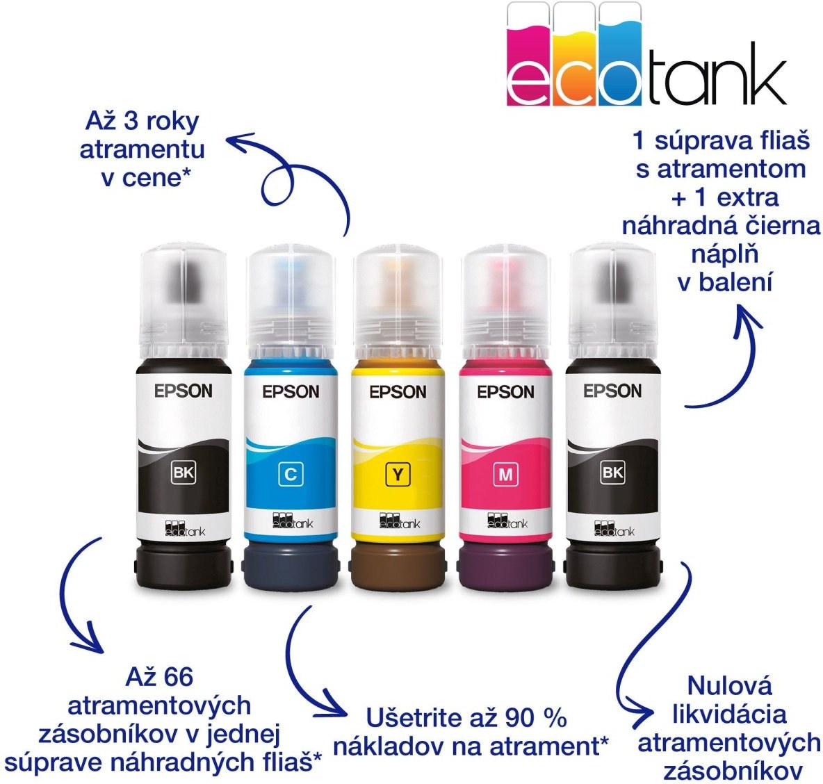 Táto úsporná tlačiareň vám ušetrí až 90 % nákladov na tlač* a dodáva sa s atramentom až na 3 roky*. Vďaka dodávanému atramentu vytlačíte až 8 100 čiernobielych a 6 500 farebných strán* a náhradná súprava atramentových náplní poskytuje ekvivalent až 66 atramentových kaziet.