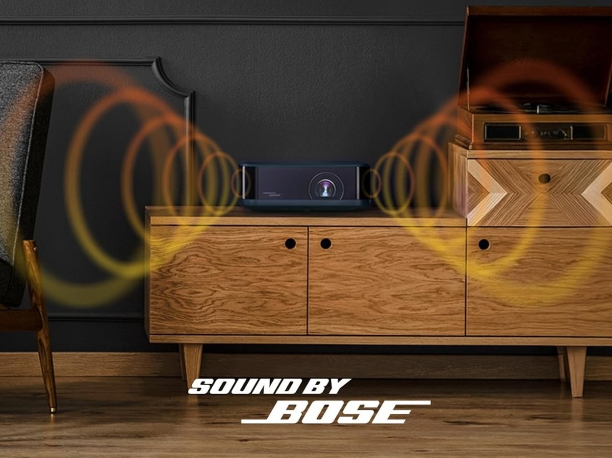 Okrem špičkového obrazu ponúka projektor aj výnimočný zvuk. Technológia Sound by Bose spolu s podporou Dolby Audio a integrovaným Bluetooth rozhraním poskytuje čistý, bohatý a pohlcujúci zvukový zážitok. Či už sledujete film, počúvate hudbu alebo hráte hry, zvuková kvalita vás vtiahne priamo do deja. Vstavaný reproduktor s výkonom 10 W je dostatočne silný aj pre väčšie miestnosti.