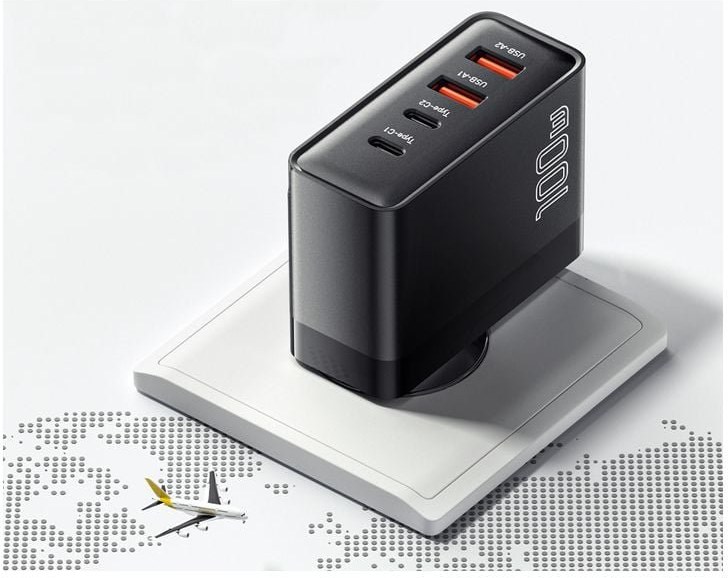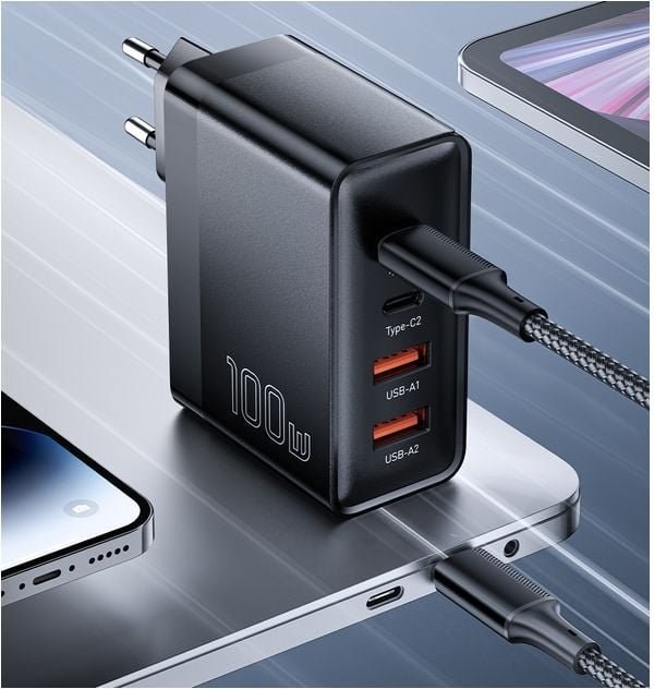 Sieťová nabíjačka Essager ECT2CA-QYB01-Z je pokročilé riešenie napájacieho adaptéra, ktoré kombinuje výnimočný výkon 100 W so schopnosťou nabíjať až štyri zariadenia súčasne prostredníctvom dvoch portov USB-C a dvoch portov USB-A. Táto čierna nabíjačka využíva revolučnú technológiu GaN založenú na nitride gália, polovodičovom materiáli novej generácie, ktorý zásadne prekonáva tradičné kremíkové komponenty v účinnosti premeny energie a tepelnom manažmente. Nitrid gália sa vyznačuje výrazne lepšou pohyblivosťou elektrónov, širším zakázaným energetickým pásmom a schopnosťou pracovať pri vyšších spínacích frekvenciách rádovo v megahertzoch, čo umožňuje používať menšie transformátory a kondenzátory pri zachovaní rovnakého alebo dokonca vyššieho výkonu ako pri bežných riešeniach. Vďaka tejto inovatívnej technológii dosahuje nabíjačka kompaktné rozmery 92 × 75 × 32,5 mm pri zachovaní vysokého výkonu, ktorý by si v prípade bežných nabíjačiek na báze kremíka vyžadoval výrazne väčšiu konštrukciu s robustným chladiacim systémom vrátane pasívnych chladičov alebo dokonca aktívnej ventilácie. Výsledná úspora miesta je až 50 % v porovnaní s tradičnými nabíjačkami rovnakého výkonu, čo je veľkou výhodou pre používateľov, ktorí cestujú alebo majú obmedzený priestor na pracovnom stole.Technológia GaN zároveň dosahuje energetickú účinnosť presahujúcu 93 percent, čo znamená, že iba 7 percent energie sa premieňa na odpadové teplo, zatiaľ čo pri starších kremíkových nabíjačkách to môže byť až dvakrát viac, čo má za následok vyššiu spotrebu energie a kratšiu životnosť komponentov v dôsledku tepelného namáhania.100 W výkonu postačuje na napájanie aj tých najnáročnejších prenosných zariadení vrátane výkonných notebookov, pričom inteligentné rozdelenie energie medzi porty zabezpečuje optimálne podmienky nabíjania pre každé pripojené zariadenie. Port USB-C1 poskytuje výstupné parametre 5V/3A, 9V/3A, 12V/3A, 15V/3A až 20V/5A s maximálnym výkonom 100 W pri samostatnom použití, čo umožňuje napríklad nabiť 13-palcový MacBook Pro len za 90 minút alebo iPhone 14 Pro Max na 60 % kapacity za 30 minút. Port USB-C2 ponúka 5V/3A, 9V/3A, 12V/2,5A, 15V/2A alebo 20V/1,5A s maximálnym výkonom 30W, zatiaľ čo dva porty USB-A poskytujú 5V/3A, 9V/2A alebo 12V/1,5A s výkonom až 18W každý. Pri súčasnom používaní všetkých štyroch portov nabíjačka inteligentne rozdeľuje dostupný výkon tak, že USB-C1 si ponechá 65 W na napájanie notebooku, zatiaľ čo zvyšné tri porty sa podelia o 15 W pri 5 V/3 A na nabíjanie menej náročných zariadení.