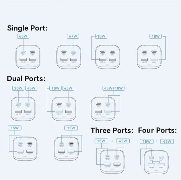 Kombinovaný výstup USB-C1 + USB-C2 + USB-A1/A2: 65 W + 20 W + 18 W