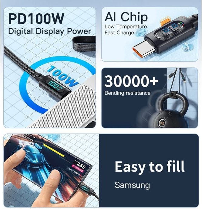 Nabíjací kábel Essager USB-C je pokročilé riešenie na efektívnu komunikáciu napájania a prenosu dát pre moderné elektronické zariadenia, ktoré sa vyznačuje jedinečným dizajnom s 90-stupňovým uhlom konektora a integrovaným LED displejom na monitorovanie výkonu nabíjania v reálnom čase. Tento inovatívny výrobok kombinuje vysoký nabíjací výkon 100 W s premysleným ergonomickým dizajnom, ktorý rieši bežné problémy spojené s používaním nabíjacích káblov počas aktívneho používania zariadenia, a predstavuje významný technologický pokrok v kategórii nabíjacieho príslušenstva. Technická špecifikácia kábla vychádza z implementácie najnovších štandardov rýchleho nabíjania s maximálnym prenosovým výkonom 100 W pri napätí 20 V a prúde 5 A. Táto výkonová charakteristika umožňuje nielen rýchle nabíjanie smartfónov a tabletov, ale najmä plnohodnotné napájanie notebookov a ďalších energeticky náročných zariadení vybavených rozhraním USB-C. Schopnosť prenášať takýto výkon robí z tohto kábla univerzálne riešenie pre celý ekosystém moderných elektronických zariadení, od najmenších nositeľných zariadení až po výkonné pracovné stanice.Kompatibilita zahŕňa širokú škálu nabíjacích protokolov vrátane Fast Charging 3.0, Power Delivery 3.0 a ďalších štandardov, zatiaľ čo inteligentná správa napájania automaticky upravuje parametre nabíjania podľa pripojeného zariadenia a poskytuje optimálny výkon 18 W, 30 W, 45 W, 60 W, 65 W, 96 W alebo celých 100 W v závislosti od maximálnych možností konkrétneho zariadenia. Kľúčovým bezpečnostným prvkom je zabudovaný elektronický značkovací čip, ktorý nepretržite monitoruje a reguluje proces nabíjania prostredníctvom sofistikovaných algoritmov. Tento polovodičový prvok funguje ako inteligentný správca energie, ktorý v reálnom čase analyzuje komunikáciu medzi zdrojom napájania a nabíjaným zariadením. Čip inteligentne identifikuje nabíjací protokol pripojeného zariadenia, či už ide o mobilný telefón, počítač, tablet alebo herný ovládač, a dynamicky upravuje napätie a prúd tak, aby bola zaistená maximálna bezpečnosť a účinnosť nabíjania. Prítomnosť tohto čipu eliminuje riziko poškodenia batérie spôsobené nestabilným prúdom alebo nesprávnymi parametrami nabíjania, čím sa výrazne predlžuje životnosť pripojených zariadení. Technológia elektronického označovania tiež umožňuje káblu komunikovať s napájacím adaptérom o svojich maximálnych možnostiach, čím sa zabezpečuje optimálna súčinnosť všetkých komponentov nabíjacieho reťazca.