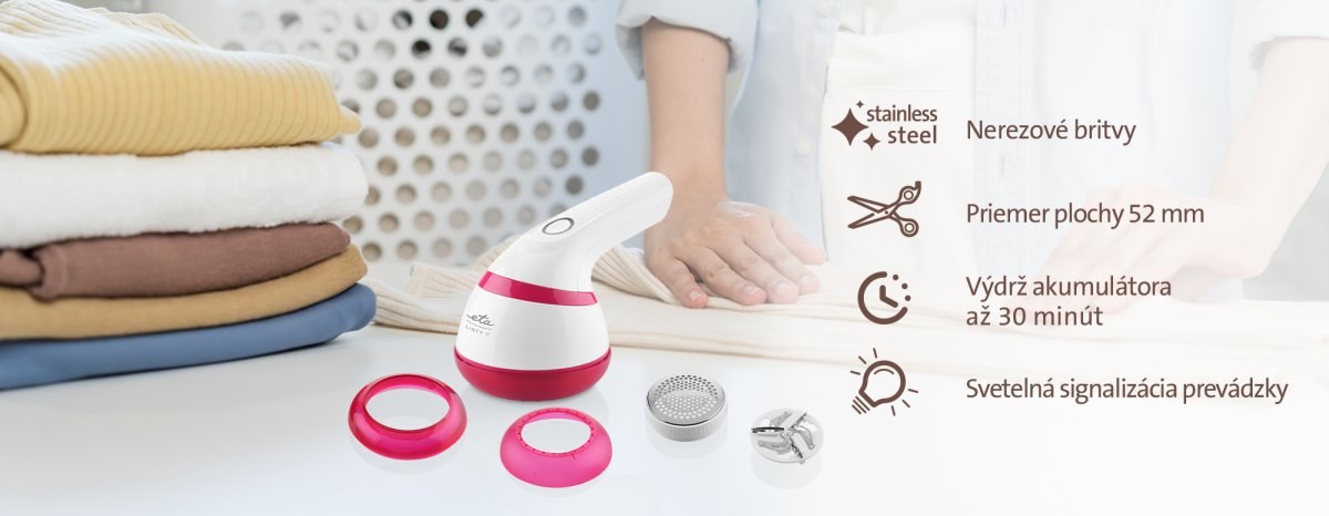 Malý a skladný odstraňovač žmolkov ETA Linty II efektívne zbaví vaše oblečenie nevzhľadných žmolkov, nití a uzlíkov, ktoré vznikajú vplyvom prania. Vďaka ETA Linty II budú vaše šaty, blúzky a svetre zasa ako nové!