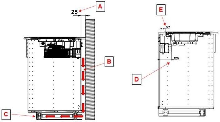 E: min. vzdialenosť medzi výrezom (na vrchu) a vnútornou zadnou skrinkou
