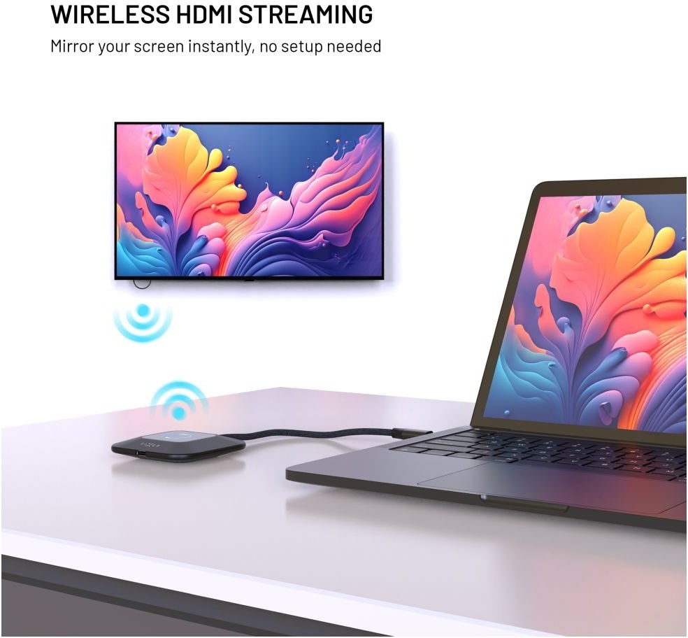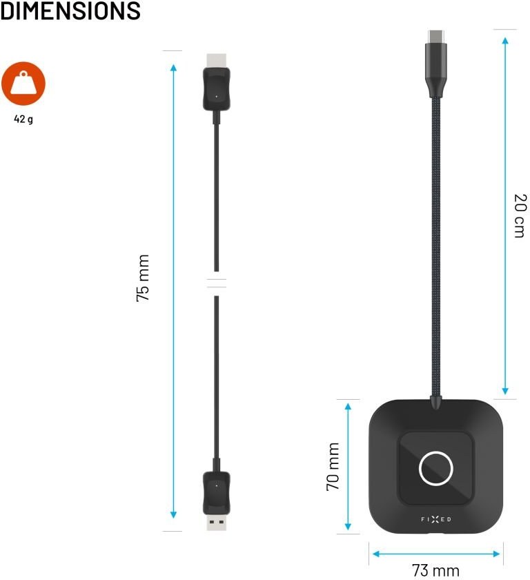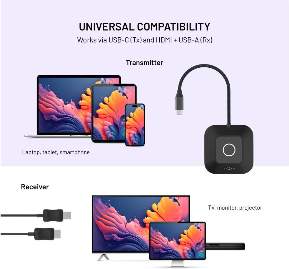 Vďaka minimálnej latencii rádovo maximálne 10 milisekúnd je obraz prenášaný prakticky v reálnom čase, bez viditeľného oneskorenia pri sledovaní videí, filmov alebo prezentácií. FIXED AirLink zároveň umožňuje rýchle priechodné nabíjanie cez USB-C port s podporou Power Delivery s výkonom až 100W, takže môžete pohodlne zdieľať a zároveň notebook napájať. Adaptér je kompatibilný s Windows, macOS, iOS aj Android zariadeniami, ktoré majú USB-C alebo Thunderbolt 3/4 port s podporou DisplayPort Alt Mode. Dosah prenosu je 30 metrov a odolný 20 cm opletený kábel zaisťuje dlhú životnosť. S FIXED AirLink prenášajte obraz úplne bezstarostne a kdekoľvek.Vlastnosti