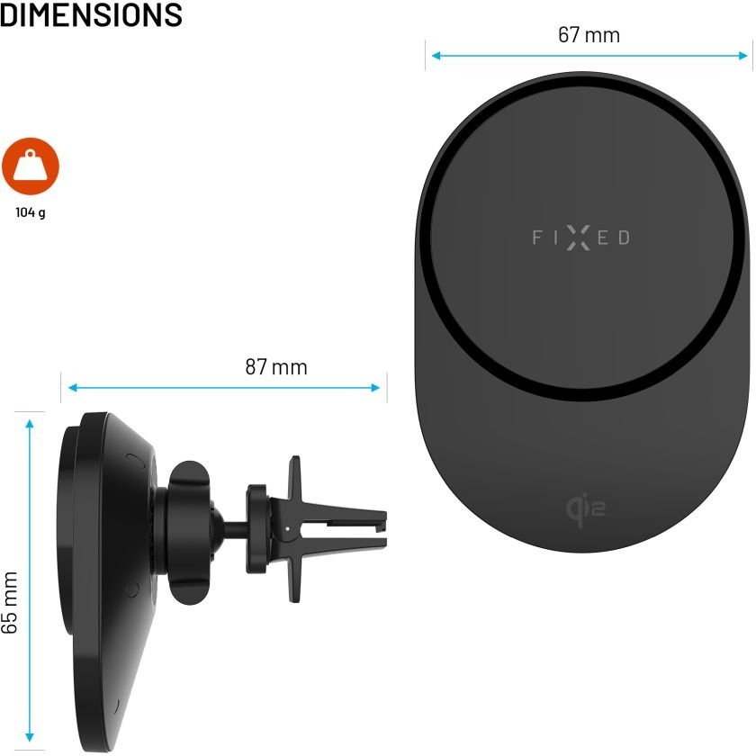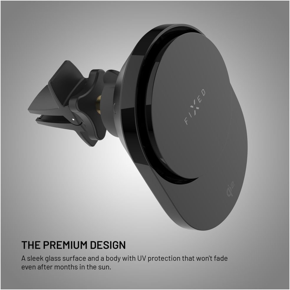Pri vyšších nabíjacích výkonoch vzniká viac tepla, ktoré môže spomaliť nabíjanie. Vďaka efektívnemu odvetrávaniu si však zariadenie udržuje optimálnu teplotu a nabíjanie prebieha stabilne. Predná plocha z tvrdeného skla dodáva držiaku elegantný vzhľad a zároveň je celý držiak opatrený UV vrstvou, ktorá chráni materiál pred blednutím spôsobeným slnečným žiarením. Držiak sa inštaluje pomocou klipu so spätným háčikom, ktorý sa zachytí za lamelu ventilácie a pevne drží aj pri otrasoch. Pomocou otočného kĺbu je možné jednou rukou ľahko nastaviť ideálny pozorovací uhol. FIXED MagAir je praktické riešenie pre bezpečné umiestnenie telefónu a rýchle bezdrôtové nabíjanie počas jazdy.Vlastnosti