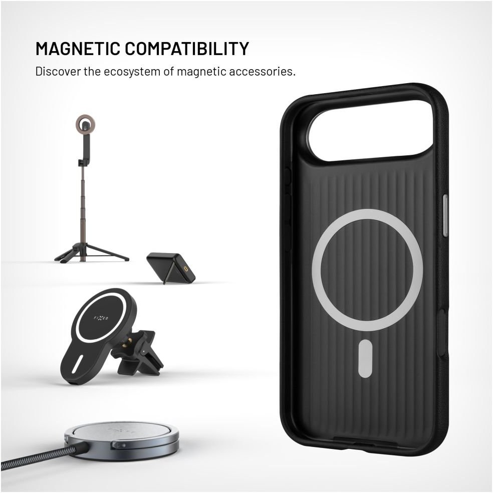 Zadný kryt FIXED MagLeather s podporou MagSafe kombinuje elegantný dizajn a praktickú ochranu telefónu. Povrch z kvalitnej vegánskej kože na prvý pohľad aj dotyk verne pripomína pravú kožu, je odolný proti poškriabaniu a dlhodobo si zachováva svoj štýlový vzhľad. Kryt je vybavený integrovanými magnetmi pre presné a bezpečné uchytenie k MagSafe nabíjačkám, držiakom aj ďalším MagSafe doplnkom. Vďaka tenkému telu a zosilneným rohom kryt spoľahlivo chráni telefón pred bežnými nárazmi a pádmi bez toho, aby zväčšoval jeho rozmery. Dizajn krytu navyše dopĺňajú kovové detaily, ako rámik okolo fotoaparátu či krytky ovládacích tlačidiel. FIXED MagLeather je ideálnou voľbou pre každého, kto hľadá spoľahlivú ochranu telefónu v elegantnom prevedení.Vlastnosti