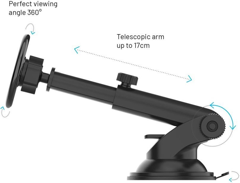 Magnetický držiak do auta FIXED MagMount XL vo verzii s predĺženým ramenom sa hodí najmä pre MPV, dodávky a všetky nákladné vozidlá, kde sú čelné sklo aj palubná doska vo väčšej vzdialenosti od vodiča. Prísavný podstavec bez problémov vydrží všetky otrasy spôsobené jazdou a zvládne aj opakované uchytenie.Jednoduché ovládanie, plynulé otáčanie a nastaviteľný uhol
