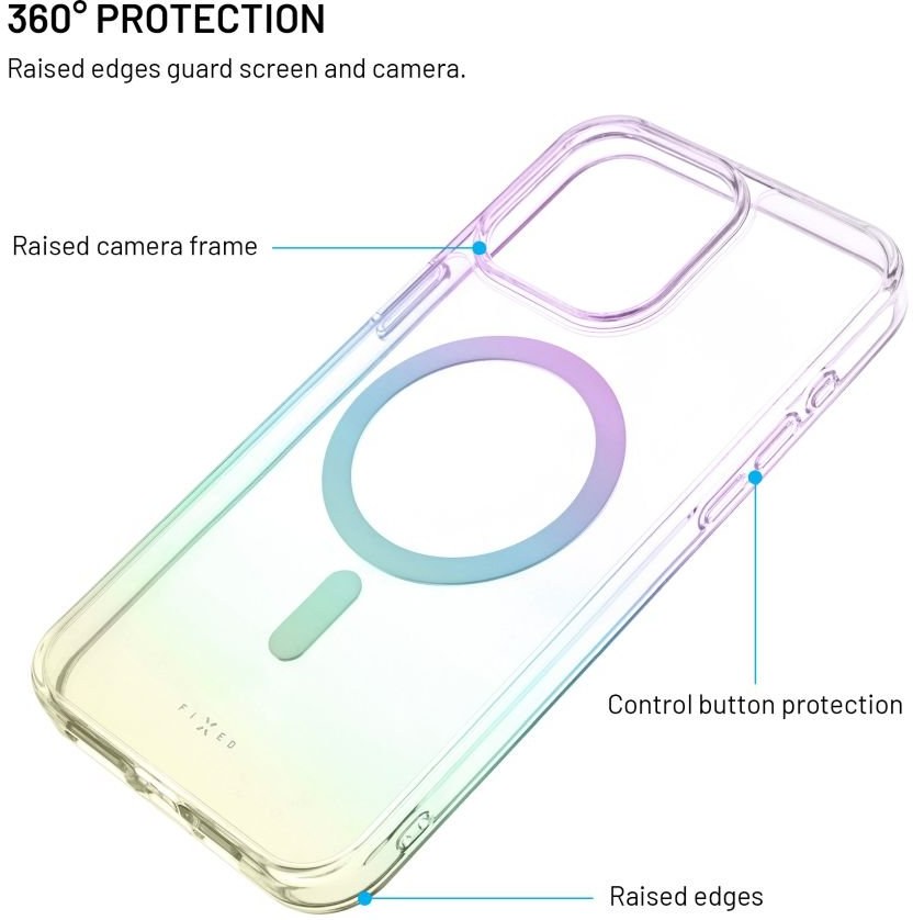Ochranný kryt FIXED MagRainbow s podporou funkcie MagSafe spoľahlivo udrží váš telefón v bezpečí pred všetkými nástrahami všedného dňa. Zadná strana z tvrdeného polykarbonátu chráni pred poškriabaním, zatiaľ čo boky z pružného TPU tlmia nárazy a pády. Dizajn krytu dopĺňa jemný dúhový efekt, ktorý z každého telefónu okamžite urobí štýlový doplnok. Použitý materiál prirodzene odoláva zažltnutiu a ľahko zvýšenej hrany v oblasti fotoaparátu a displeja ich chráni pred kontaktom s povrchom a prípadným poškriabaním. Kryt je doplnený o integrované MagSafe magnety, ktoré sa presne a stabilne uchytia k nabíjačkám a ďalšiemu MagSafe príslušenstvu. Kryt FIXED MagRainbow spája praktickú ochranu s jednoduchým dizajnom, ktorý telefónu dodá štýl.Vlastnosti