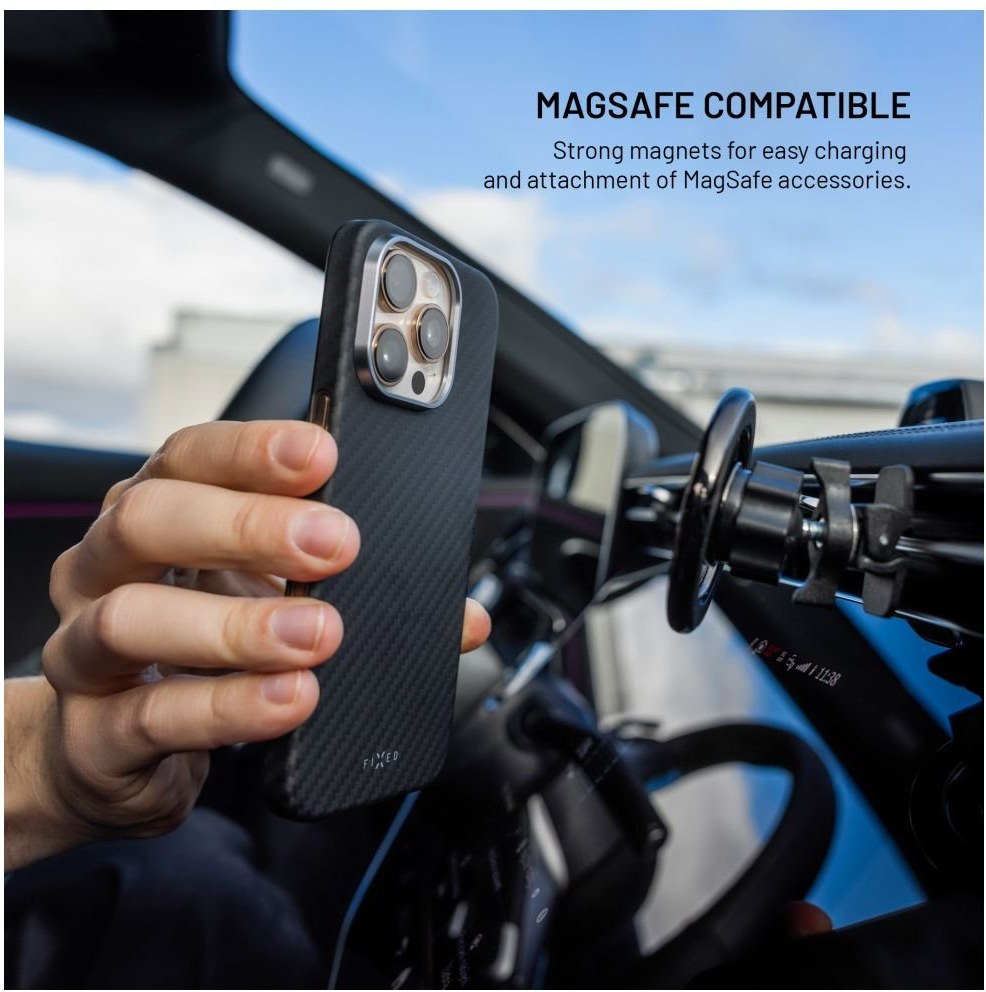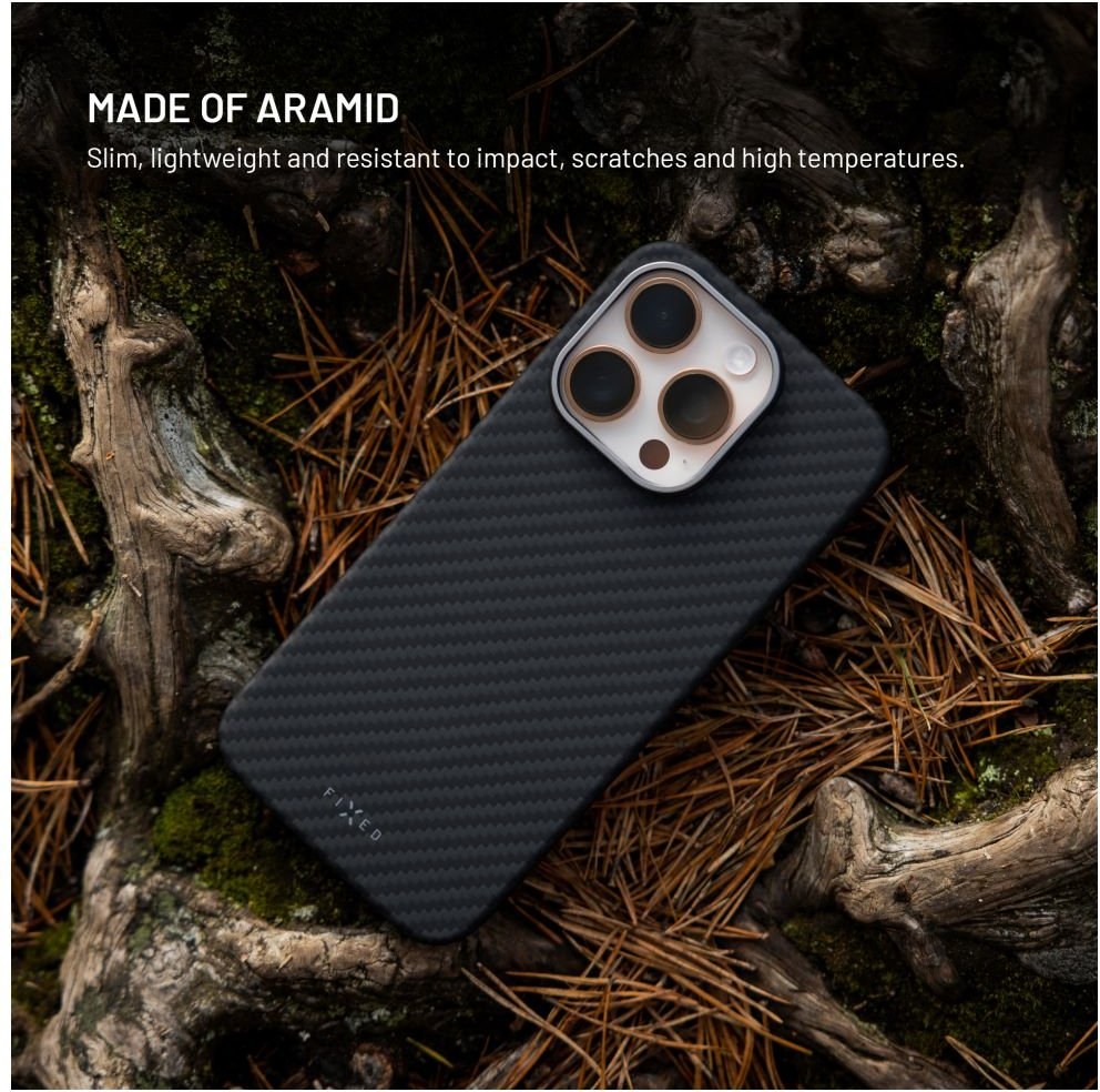 Ochranný kryt FIXED MagVelar s podporou MagSafe spája odolnosť a štýlový vzhľad. Kryt je tvorený aramidovými vláknami, ktoré vynikajú rovnakými vlastnosťami ako kevlar – materiál známy svojou mimoriadnou pevnosťou a odolnosťou s využitím v letectve aj vojenstve. Odoláva nárazom, poškriabaniu, vysokým teplotám aj extrémnym podmienkam a dokonale tak chráni váš telefón pred každodenným opotrebením. Vďaka ultratenkému a ľahkému dizajnu nijako nezväčšuje veľkosť zariadenia, zatiaľ čo zvýšený kovový rámček účinne chráni šošovky fotoaparátu. Kryt je navyše vybavený MagSafe magnetmi, ktoré zaisťujú bezproblémové bezdrôtové nabíjanie aj kompatibilitu s ďalším MagSafe príslušenstvom. FIXED MagVelar je ideálnou voľbou pre každého, kto hľadá maximálnu ochranu v tenkom a štýlovom dizajne.Vlastnosti