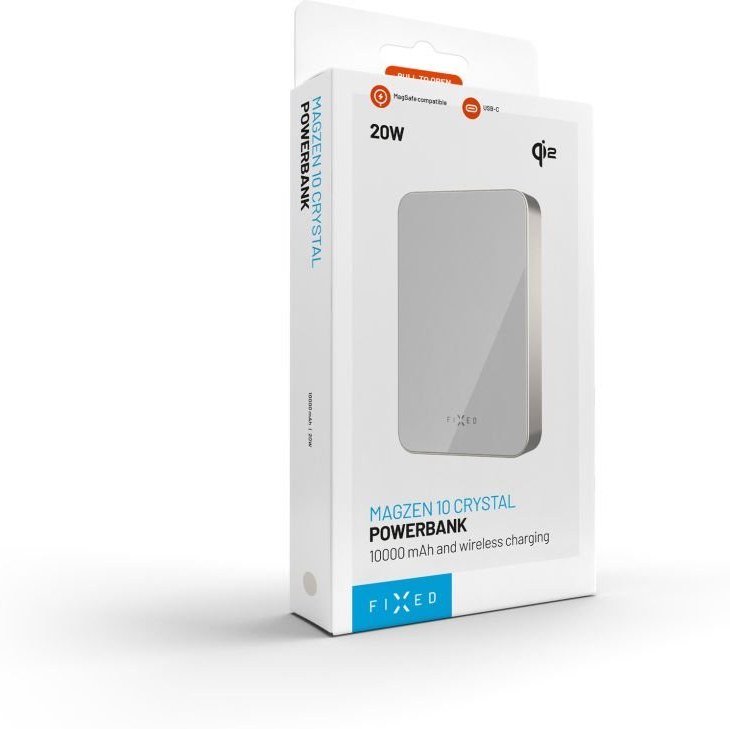 Powerbanka FIXED MagZen 10 Crystal s kapacitou 10 000 mAh a certifikáciou Qi2 prináša rýchle a efektívne nabíjanie všetkých telefónov s podporou tejto technológie. Vďaka integrovaným MagSafe magnetom ju možno prichytiť na zadnú stranu telefónu iPhone 12 a novších alebo telefónov opatrených MagSafe krytom. Po prichytení sa automaticky spustí nabíjanie s výkonom až 15W. Pokiaľ váš telefón MagSafe nepodporuje, môžete nabíjaciu plochu powerbanky využiť ako bezdrôtovú nabíjaciu podložku. Powerbanka podporuje aj rýchle nabíjanie cez USB-C port s výkonom až 20W. Dajú sa tak nabíjať dve zariadenia zároveň – bezdrôtovo výkonom 5W a cez USB-C port výkonom 10W. Kapacita 10 000 mAh vystačí na niekoľko plných nabití a stav kapacity prehľadne zobrazujú štyri LED diódy. Telo powerbanky tvorí štýlová, a napriek tomu odolná kombinácia kovového rámu a tvrdeného skla s matnou úpravou na nabíjacej ploche, ktorá chráni telefón pred poškriabaním. FIXED MagZen 10 Crystal je predstavuje elegantné a výkonné riešenie pre každého, kto chce mať dostatok energie neustále po ruke.Vlastnosti