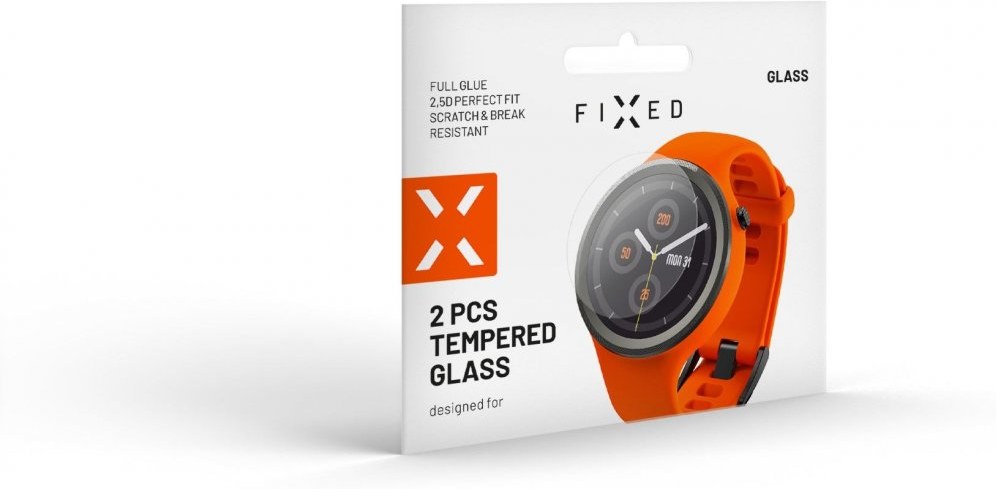 Vysoko kvalitné temperované tvrdené sklo FIXED je ideálnou voľbou na ochranu displeja vašich hodiniek. Predídete tak nešťastiu v podobe škrabancov alebo prasknutého displeja. Špeciálna 2,5 D technológia skla je určená priamo pre displej so zaoblenými okrajmi. So svojou minimálnou hrúbkou takmer nijako nezväčšuje rozmery hodiniek. Sklo má vysokú citlivosť, ovládanie dotykového displeja zostane rovnako prirodzené ako na displeji bez skla. Ochranné sklo disponuje vysokým stupňom odolnosti proti rôznym škrabancom a ryhám. Vďaka 100% priehľadnosti zostanú farby displeja hodiniek rovnako žiarivé aj po inštalácii skla. Oleofóbna úprava skla zamedzí rôznym šmuhám a odtlačkom prstov na displeji. V balení nájdete 2 ks ochranného skla a všetko potrebné pre jednoduchú a rýchlu inštaláciu.Vlastnosti