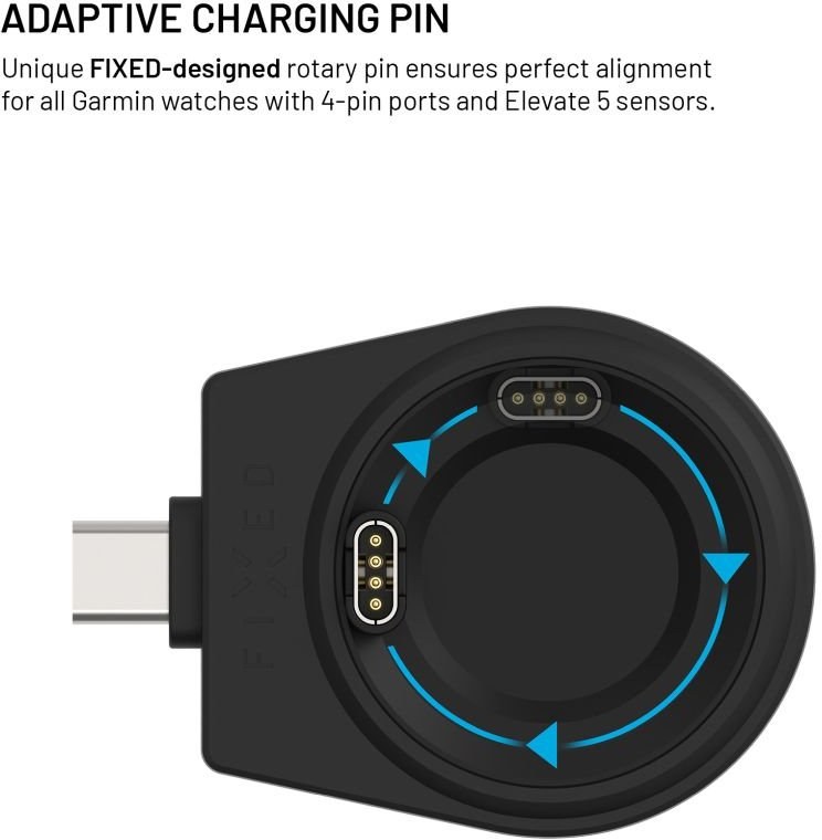 Otočný vnútorný krúžok s pinmi je možné posúvať podľa potreby a prispôsobiť rôznym modelom hodiniek, vrátane tých so senzorom Elevate 5. Vďaka predĺženému USB-C konektoru je možné adaptér ľahko pripojiť aj k iným zariadeniam, ako sú bežné nabíjačky, powerbanka, notebook alebo telefón. Jemný povrch nabíjacích plôch chráni zariadenie pred poškriabaním, zatiaľ čo protišmykové podložky zaisťujú stojanu stabilitu. Pre maximálny výkon odporúčame použitie napájacieho adaptéra s výkonom minimálne 25 W v štandarde PD. Stojan FIXED Powerstation pre Garmin je ideálnym riešením pre každého, kto hľadá praktický a štýlový spôsob, ako mať všetky svoje zariadenia vždy plne pripravené.Vlastnosti