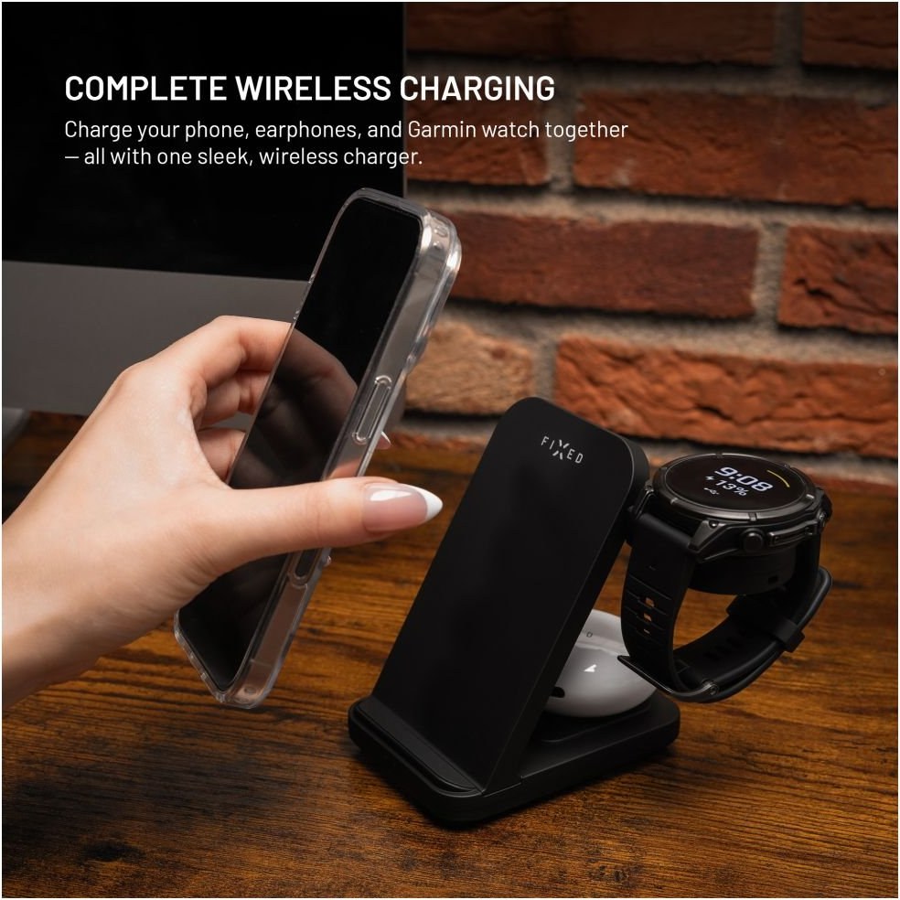 Bezdrôtový stojan FIXED Powerstation pre Garmin ponúka pohodlné nabíjanie až troch zariadení zároveň. Hlavná plocha podporuje rýchle nabíjanie telefónov výkonom až 15 W a vďaka kombinovanej cievke je možné telefón umiestniť ako v horizontálnej, tak aj vertikálnej pozícii. Druhá plocha s výkonom až 5 W je ideálna pre bezdrôtové slúchadlá alebo iné bezdrôtové príslušenstvo. Súčasťou stojančeka je odnímateľný adaptér pre chytré hodinky Garmin, navrhnutý vo vlastnom dizajne značky FIXED.Flexibilné nabíjanie