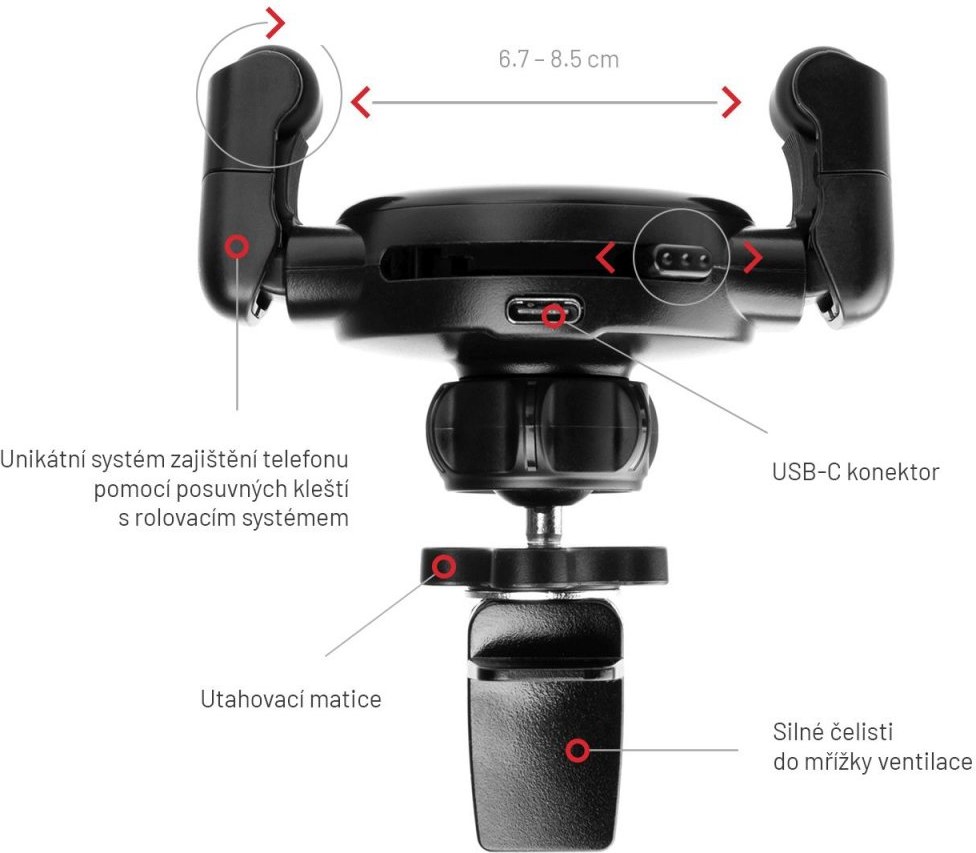 - univerzálny držiak s bezdrôtovým nabíjaním- určený na pripevnenie do mriežky ventilácie automobilu