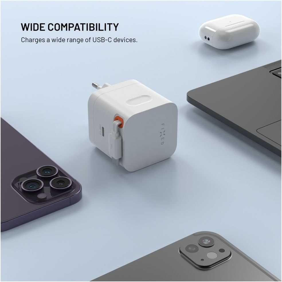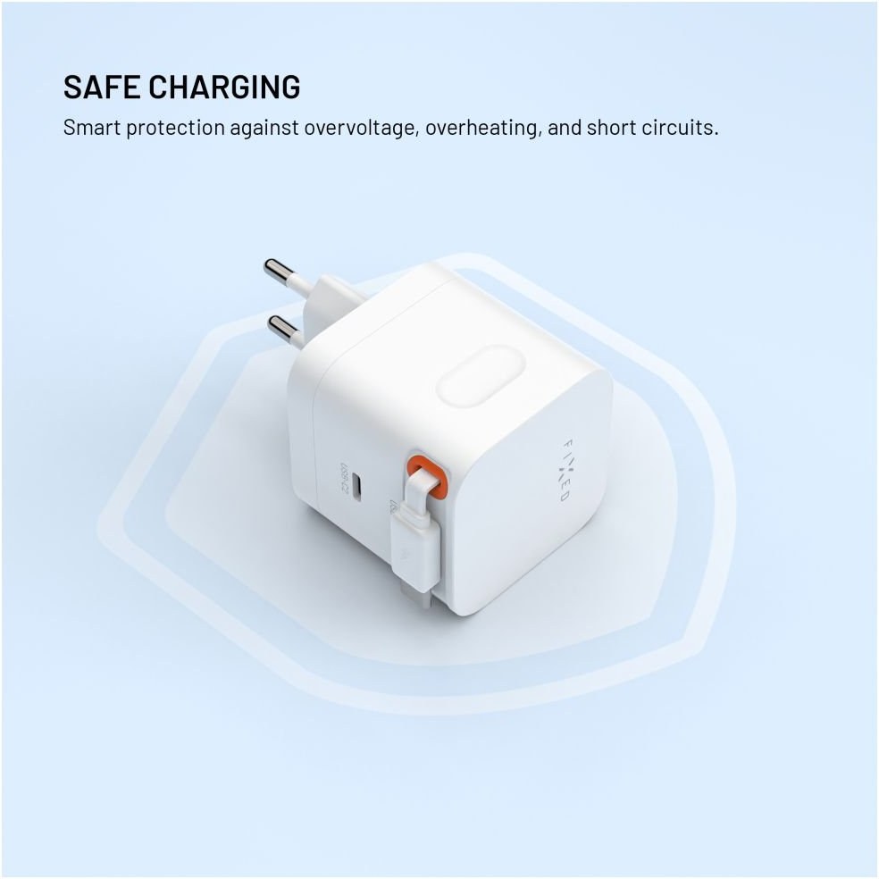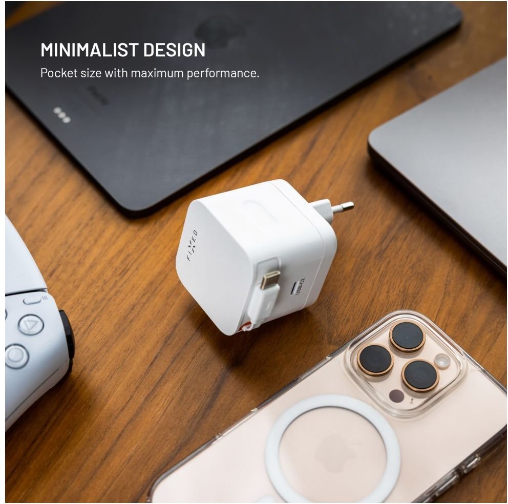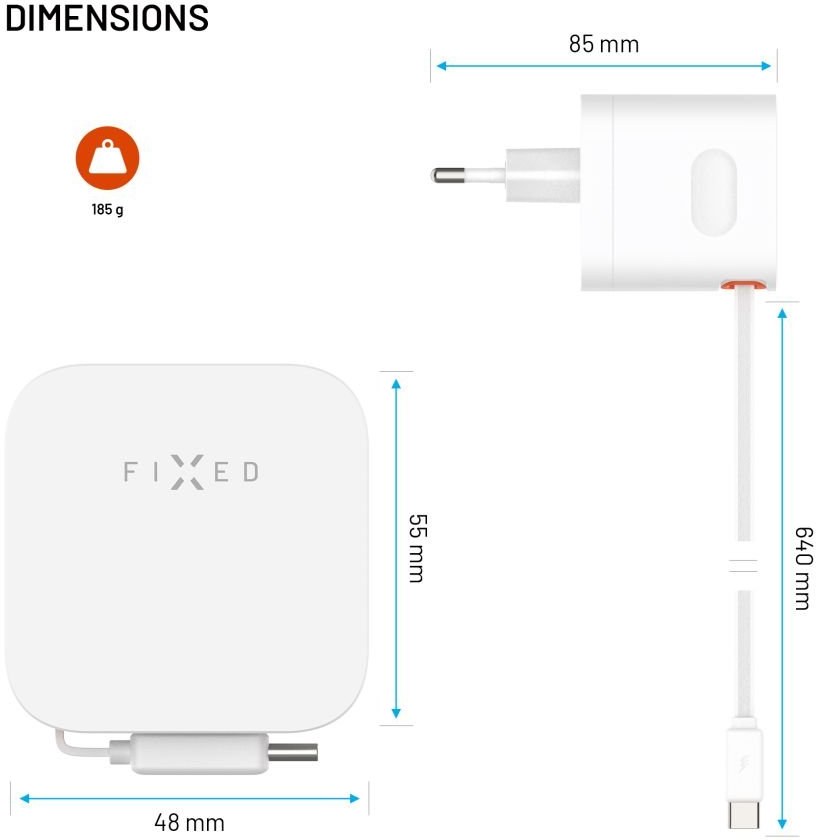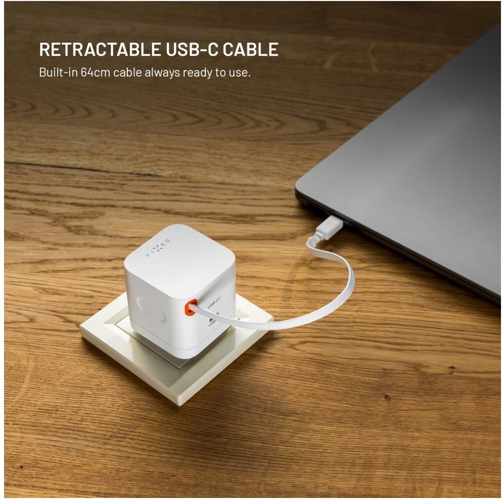 Kompaktná a výkonná sieťová nabíjačka FIXED s celkovým výkonom až 65W je ideálnym riešením na rýchle a efektívne nabíjanie všetkých vašich zariadení – od telefónu až po notebook. Vďaka pokročilej GaN technológii ponúka vysoký nabíjací výkon bez prehrievania a pritom si zachováva minimálne rozmery oproti bežným adaptérom s podobným výkonom. Nabíjačka je vybavená jedným USB-C portom a integrovaným samonavíjacím USB-C káblom s dĺžkou 64 cm, ktorý sa magneticky uchytáva k telu nabíjačky, takže sa nezamotá a je vždy pripravený na použitie. Pri využití jedného z USB-C výstupov ponúkne plný výkon až 65W. Pokiaľ potrebujete nabíjať dve zariadenia naraz, nabíjačka výkon rozdelí – kábel poskytuje výkon až 45W a USB-C port 20W. Samozrejmosťou je kompletná ochrana proti prepätiu, prehriatiu a skratu. Či už ste doma, v kancelárii alebo na cestách majte praktickú a spoľahlivú nabíjačku stále po ruke.Vlastnosti