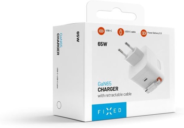 Fixed sieťová GaN nabíjačka s 2xUSB-C, podpora PD 3.0, so samonavíjacím káblom, 65W, biela