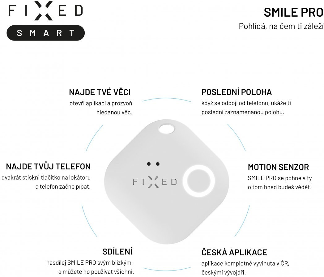 - pomůže najít ztracenou věc - pomocí aplikace FIXED Smart v telefonu prozvoníte váš Smile PRO