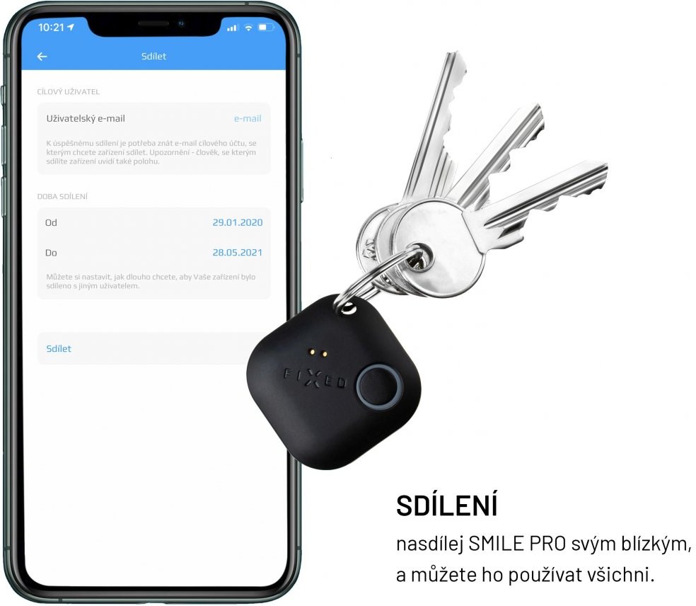 U vašich chytrých trackerov Smile PRO si môžete v aplikácii FIXED Smart nastaviť zdieľanie s viacerými užívateľmi. Jeden Smile tak možno súčasne spárovať s viacerými telefónmi a na každom zariadení potom vidíte jeho polohu. Máte strach, či vaše dieťa dorazil v poriadku do školy? Pokiaľ má so sebou zdieľaný Smile lokátor pripojený k telefónu, vo vašej aplikácii ľahko uvidíte, že dorazil v poriadku na miesto. Rovnako dobre Smile PRE poslúži napríklad pri zdieľaní polohy kľúčov od vozidla alebo iné dôležité veci, používanú viac ľuďmi v domácnosti alebo v práci. Zdieľaný tracker môžete pri hľadaní tiež na diálku prozvonit. Sdílení Smile PRO funguje bez problémů napříč operačními systémy iOS a Android.