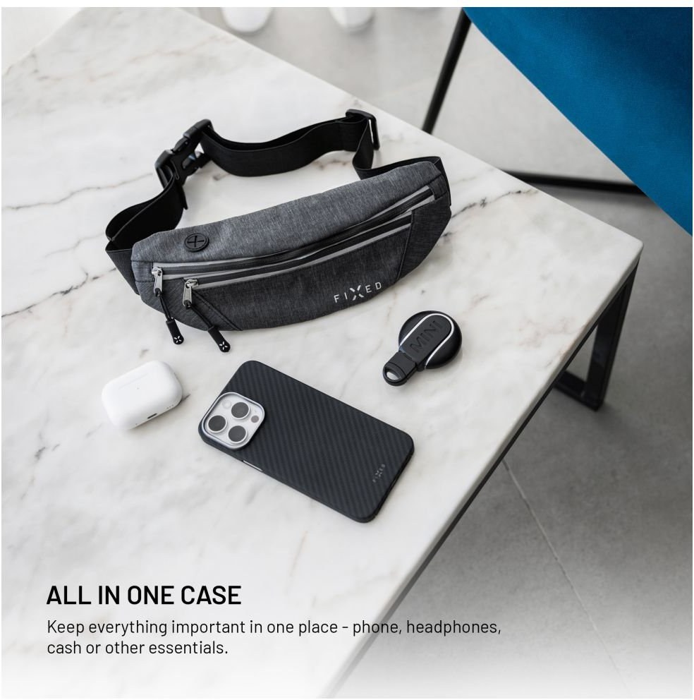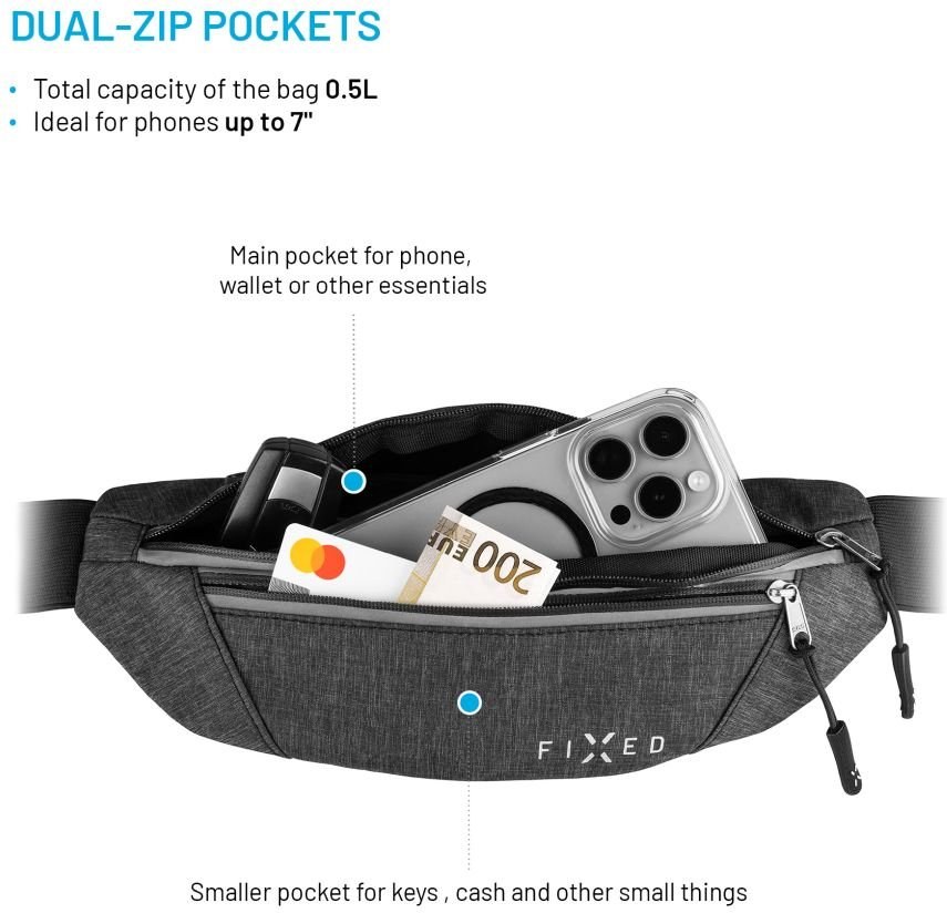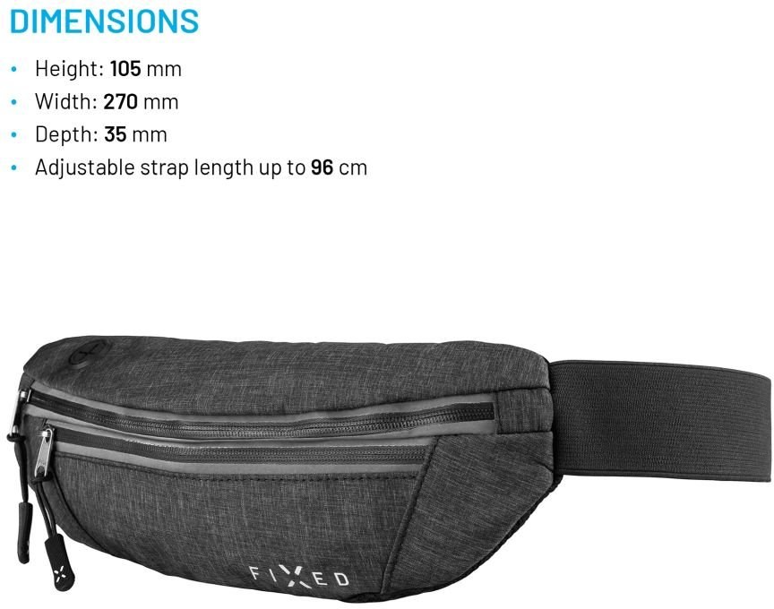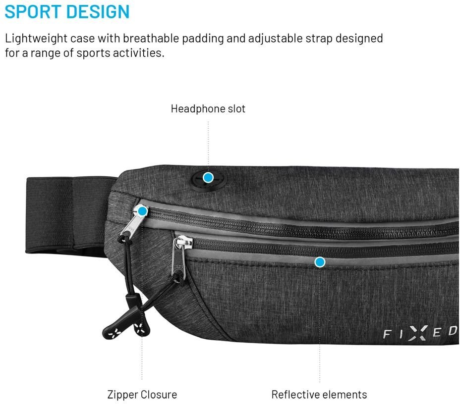 So športovou ľadvinkou FIXED Sportbelt máte všetko dôležité vždy po ruke. Vďaka dvom vreckám a celkovému objemu 0,5 litra pohodlne pojme všetky nevyhnutnosti. Hlavné vrecko poskytuje dostatok priestoru pre telefón s uhlopriečkou až 7", peňaženku alebo slúchadlá. Menšie predné vrecko je zas ideálne na kľúče, karty a iné drobnosti. O bezpečí vecí sa postará odolný materiál, ktorý chráni pred prachom a vlhkosťou, zatiaľ čo reflexné prvky zaisťujú lepšiu viditeľnosť za šera. prackou zaisťujú maximálne pohodlie pri nosení, či už bežíte, idete na bicykli alebo vyrážate na túru.Vlastnosti
