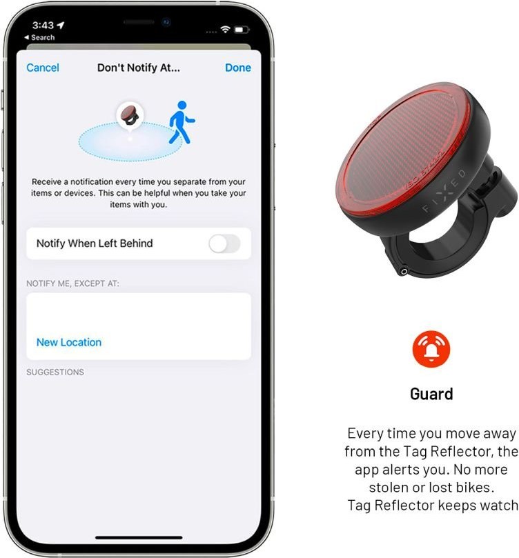 Navyše je odrazka vybavená zvukovou signalizáciou, ktorá umožňuje rýchlejšiu lokalizáciu v prípade straty. Vďaka štandardu IP67, ktorý zaručuje odolnosť proti vniknutiu prachu a vody sa nemusíte obávať vyjsť na bicykli za každého počasia. Vzhľad pripomínajúci bežnú červenú odrazku nepriťahuje pozornosť zlodejov a zároveň plní svoju primárnu funkciu bezpečnostného prvku. Odrazka sa ľahko inštaluje pod sedlo kolesa na tzv. sedlovku, súčasťou je silikónová podložka, ktorá chráni bicykel pred poškriabaním. Užívajte si s FIXED Tag Reflector bezstarostnú jazdu a majte svoj bicykel neustále pod kontrolou v sieti Apple ekosystému.Stráži