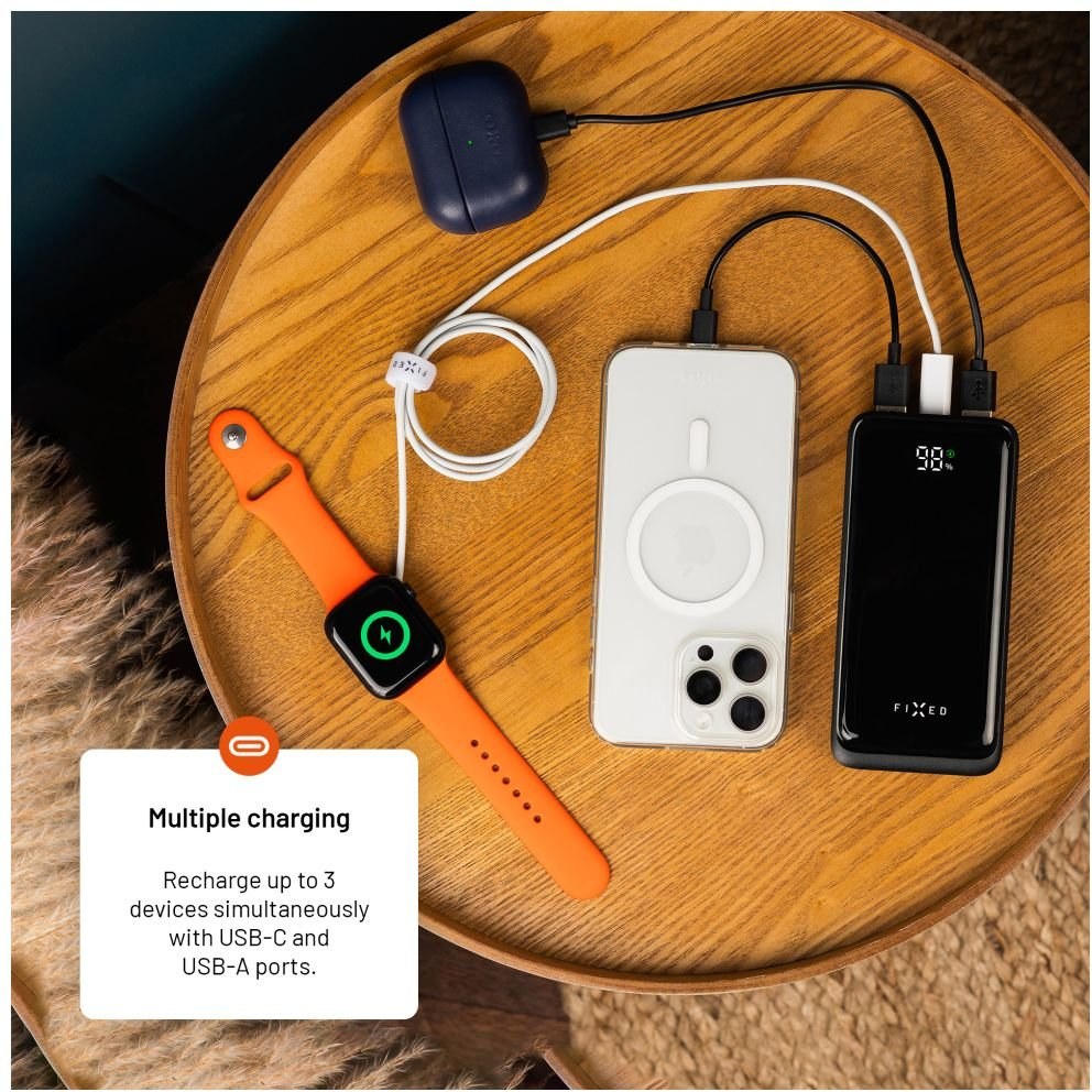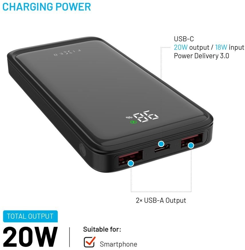 Powerbanka FIXED Zen2 10 predstavuje spoľahlivý záložný zdroj energie, ideálny na cesty aj na každodenné použitie. S kapacitou 10 000 mAh spoľahlivo dobije telefón, slúchadlá, hodinky či ďalšie zariadenia. Vďaka dvom USB-A portom a jednému USB-C portu umožňuje nabíjať až tri zariadenia súčasne. USB-C port navyše podporuje rýchle nabíjanie Power Delivery 3.0 s výkonom až 20 W, ktoré sa spustí automaticky po pripojení zariadenia. O aktuálnom stave kapacity informuje prehľadný LCD displej s elegantným lesklým povrchom. Samotnú powerbanku je možné ľahko dobiť cez USB-C port výkonom až 18 W, a to aj počas toho, kedy je powerbankou nabíjané ďalšie zariadenia. Vďaka kompaktným rozmerom a nízkej hmotnosti sa powerbanka FIXED Zen2 10 ľahko zmestí do každej kabelky alebo batohu. Je tak ideálnym spoločníkom na cesty, ktorý vašim zariadeniam dodá energiu kedykoľvek a kdekoľvek.Vlastnosti