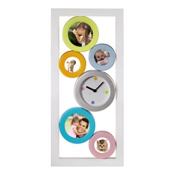 - hodiny s okrúhlymi farebnými otvormi na 5 veselých fotografií- fotografie sú rozmiestnené okolo hodín