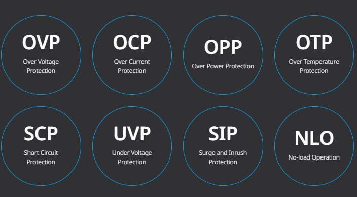 Komplexná sada ochranných obvodov – OVP, OCP, OPP, OTP, SCP, UVP, SIP a NLO pre bezpečnú prevádzku celého systému.