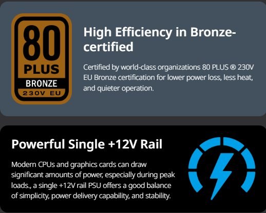 Energetická efektivita zdroja je potvrdená certifikáciou 80 PLUS 230V EU Bronze, ktorá garantuje účinnosť až 88 % pri typickej záťaži. To znamená nižšie straty energie, menšiu produkciu tepla a celkovo tichšiu a úspornejšiu prevádzku. Aktívna korekcia účinníka (Active PFC) zároveň zabezpečuje stabilné napájanie a lepšie využitie elektrickej energie zo siete.