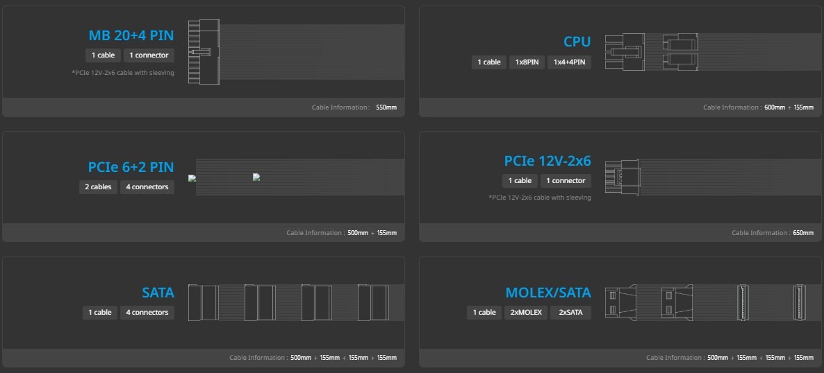 Zdroj disponuje širokou ponukou napájacích konektorov pre moderné PC zostavy. K dispozícii je hlavný 24-pin ATX konektor, CPU konektory, PCIe konektory pre grafické karty, SATA konektory pre disky aj Molex konektory pre staršie zariadenia. Nechýba ani moderný PCIe 12V konektor pre novšie grafické karty. Vďaka tomu nie je potrebné používať redukcie. Zapojenie komponentov je jednoduché a prehľadné.1× 24-pin ATX hlavný napájací konektor