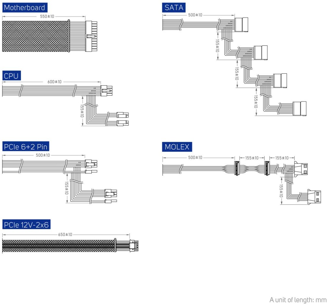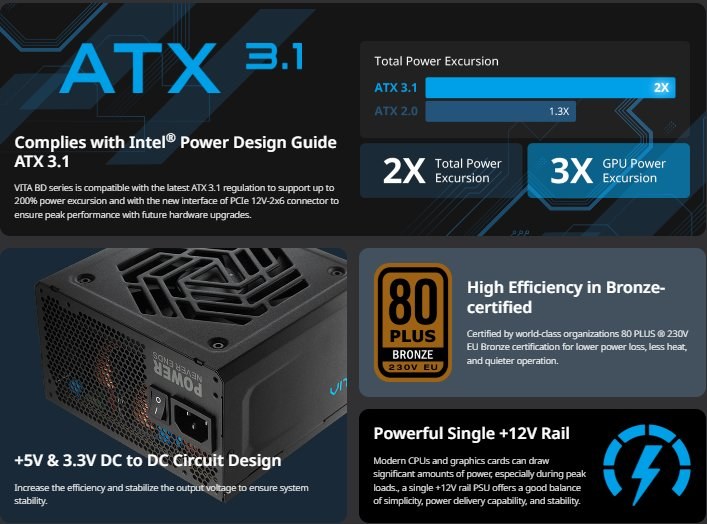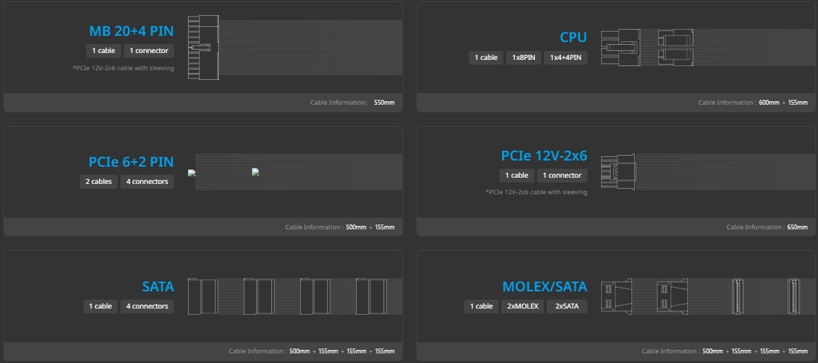 Zdroj je vyhotovený v štandardnom ATX formáte a spĺňa modernú špecifikáciu ATX 3.1. Tento štandard je navrhnutý pre aktuálne a budúce generácie hardvéru, najmä grafické karty s vysokými nárokmi na napájanie. ATX 3.1 zabezpečuje lepšiu toleranciu krátkodobých špičiek výkonu. Zdroj je plne kompatibilný s modernými základnými doskami a PC skrinkami. Inštalácia je jednoduchá a bez nutnosti dodatočných úprav.