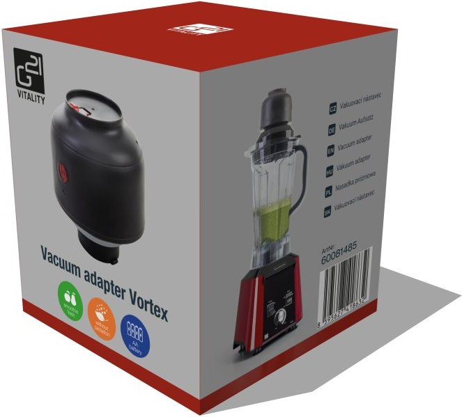 Vákuovací nástavec G21 Vortex je revolučnou novinkou, s ktorej pomocou pripravíte dokonale hladké smoothie, krémové polievky, príkrmy pre deti, masla a iné mixované pokrmy. V rozmixovanej zmesi nenájdete žiadne nežiaduce vzduchové bubliny, ktoré by rozdeľovali jednotlivé zložky pokrmu. Pripravte si dokonalú jemnú zmes obľúbených chutí, ktorá vás jemne pohladí po jazyku.