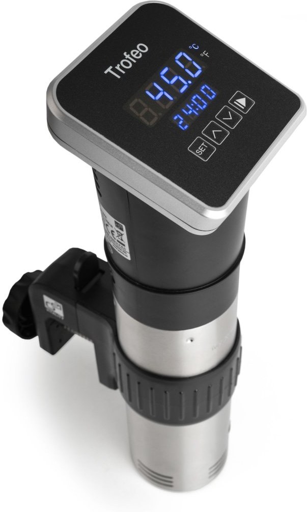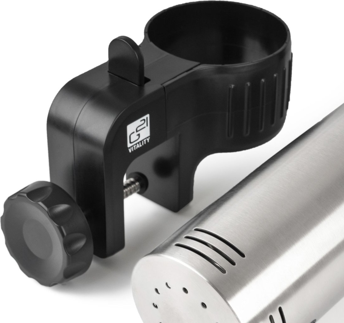 Ponorný pomalý varič G21 Trofeo s príkonom 1 200 W je skutočným majstrom v sous-vide varení vo vákuu. Je pripravený na každodenné bezpečné použitie a vyladený do najmenších detailov. Elegantné telo sa skladá z dvoch častí – ponorná časť s vnútornou varnou špirálou a vrchná časť s elektronikou a okrúhlym dotykovým displejom. Pre bezpečné zavesenie sous-vide variča G21 Trofeo na okraj varnej nádoby sme ponorný varič vybavili posuvným upevňovacím klipsom.