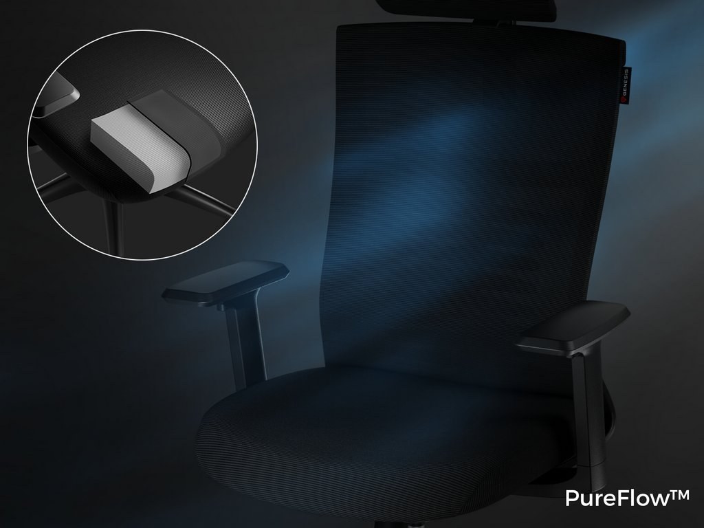 Už vás nebaví kožené poťahy a hľadáte kreslo, ktoré vám poskytne plnohodnotné odvetrávanie? Operadlo a opierka hlavy kresla sú vyrobené zo sieťovaného, priedušného materiálu PureFlowPLUS™. Ten sa nielen ľahko čistí, ale je tak odolný a pružný, že z neho bolo vyrobené aj celé sedadlo. Neobsahuje žiadnu penu, ktorá by sa časom mohla pokrčiť a ovplyvniť vaše držanie tela. Zabudnite na to, že sa stolička príliš zahrieva, a sústreďte sa na to, čo je naozaj dôležité.