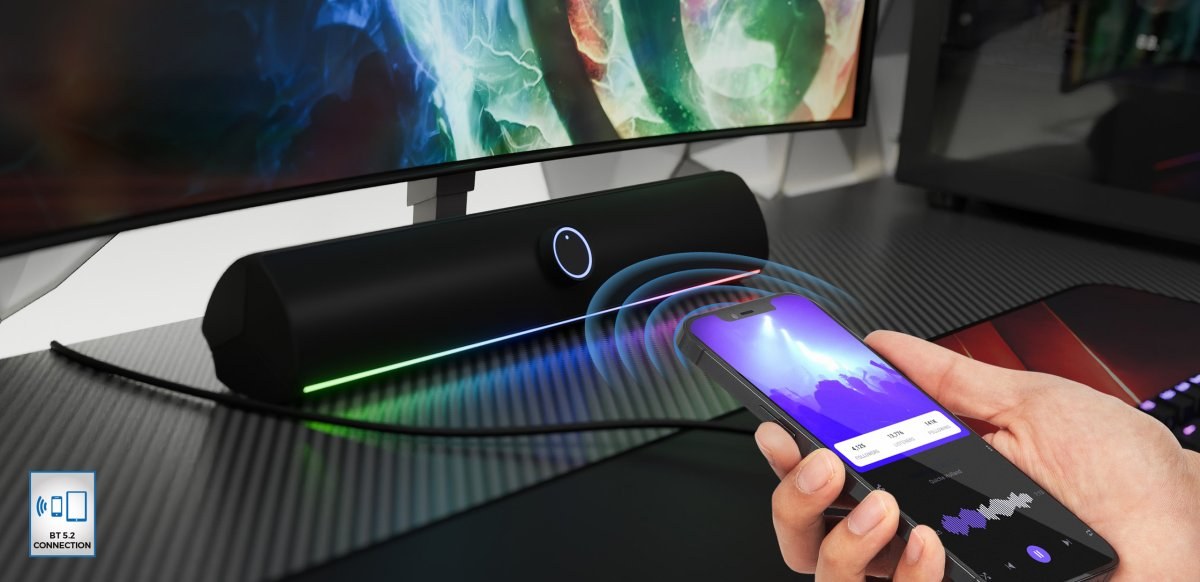 Zoznámte sa so soundbarom GENESIS HELIUM 312 BT - reproduktorom vytvoreným pre hráčov, ktorí očakávajú skvelý zvuk v malých rozmeroch aj efektívne prehrávanie hudby z rôznych zariadení vďaka BT 5.2. A to nie je všetko, čím vás prekvapí. Ovládajte basy a podsvietenie jediným kliknutím a premeňte svoj herný kútik.Chcete prehrávať hudbu z viacerých zariadení bez toho, aby ste ich museli prepájať? Nie je to nič zložité. Stačí GENESIS HELIUM 312 BT zapnúť pripojením k počítaču pomocou USB typu A a začať ho používať. A ak budete chcieť prehrať nahrávku z akéhokoľvek zariadenia s podporou BT, urobíte to v priebehu niekoľkých sekúnd spárovaním zariadenia so soundbarom.