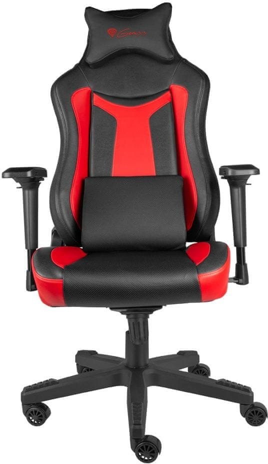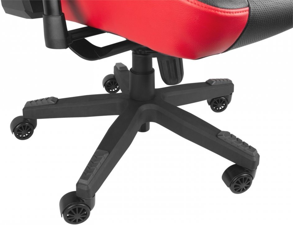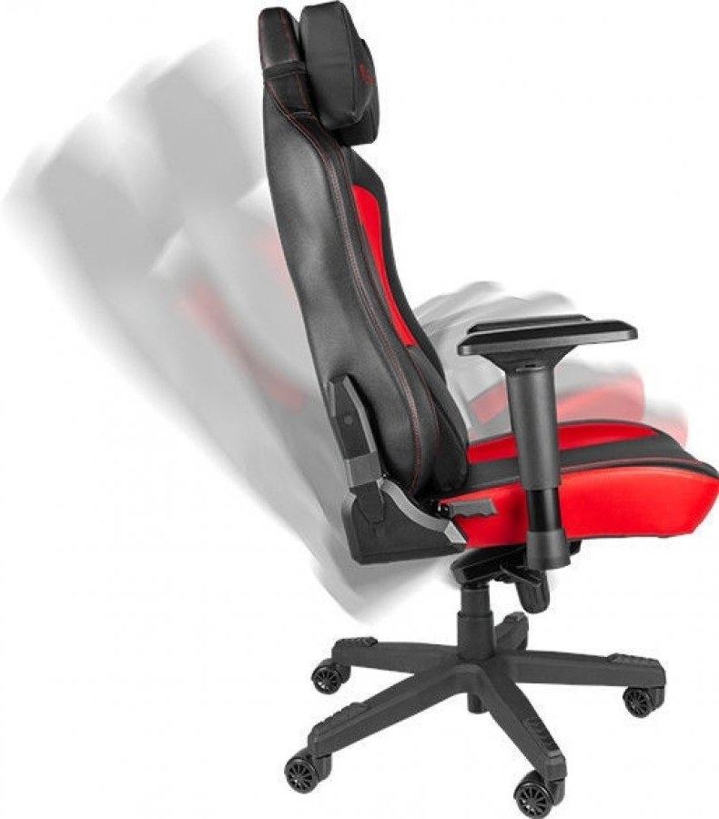 herná stolička, robusná kovová konštrukcia, penová výplň, PU koža, 5-ramenná základňa, nosnosť do 150 kg, bedrový a hlavový vankúš, nastaviteľná výška sedadla, 4D opierky rúk, operadlo s upraviteľným sklonom do 165°, hojdací mechanizmus, čierno-červenéZobraziť viac