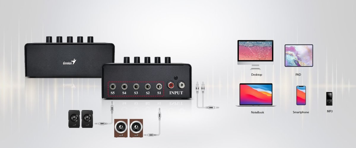 Genius, Audio - Stereo Switch Box, výstup až na 5 reproduktorov
