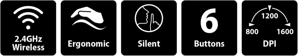 myš, kancelárska, symetrická, USB bezdrôtový prijímač, optický senzor, 6 tlačidiel, tichý klik (silent click), max. citlivosť 1600DPI, šedáZobraziť viac